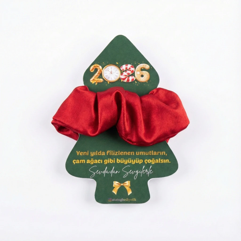 Kartın üzerinde yer alan "Yeni yılda filizlenen umutların, çam ağacı gibi büyüyüp çoğalsın" mesajı, hediyenize manevi bir değer katarken, kaliteli saten kumaştan üretilen lastik toka, günlük kullanımda şıklığı tamamlayan kalıcı bir hatıra olarak kalır.