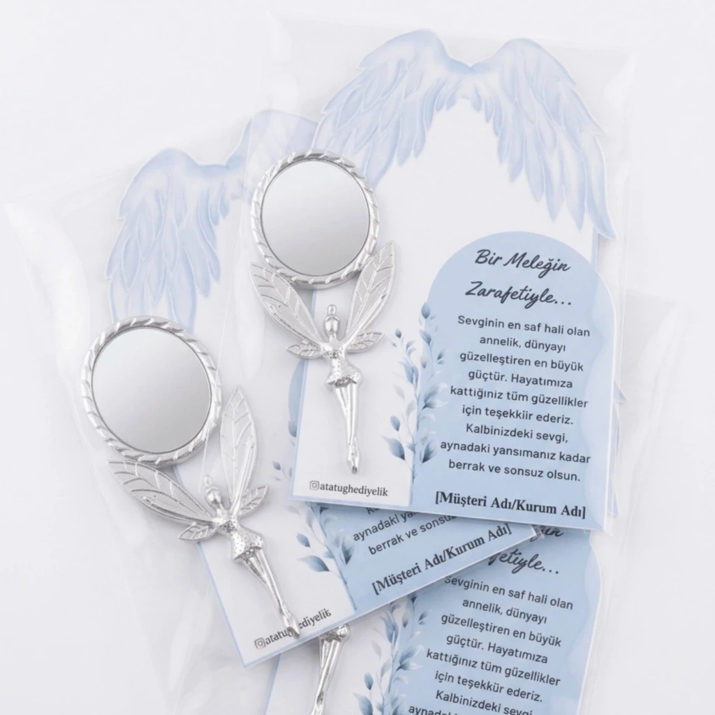 Kurumunuza Özel Zarafet: 3'lü Paket Özelleştirilebilir Kartlı Gümüş Metal Melek Ayna
