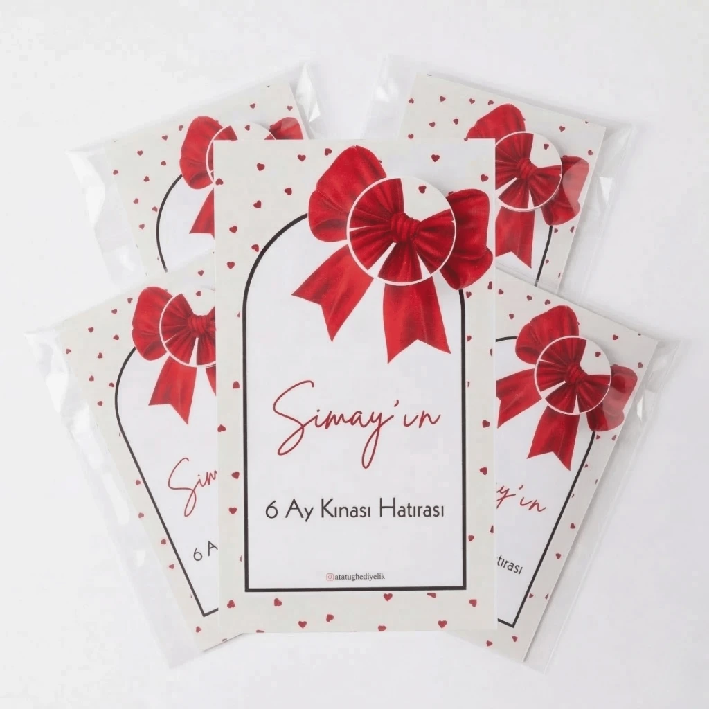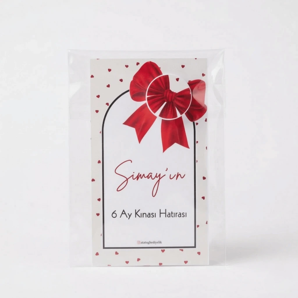 Kişiye Özel Tasarım: Ürün, üzerinde "Simay’ın 6 Ay Kınası Hatırası" (veya talep ettiğiniz isim) yazılı, şık fiyonk ve kalp desenli kart tasarımıyla sunulur.