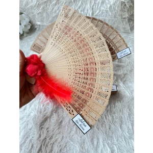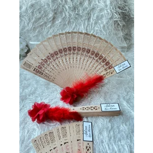 3'lü Kına Gecesi Hatıra Yelpazesi – Kırmızı Tüylü & Kişiye Özel Etiketli | 20 cm