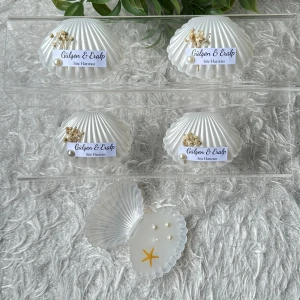 İstiridye Kutuda Mum Hediyelik – Kişiye Özel Etiketli, İnci & Deniz Yıldızı Süslemeli