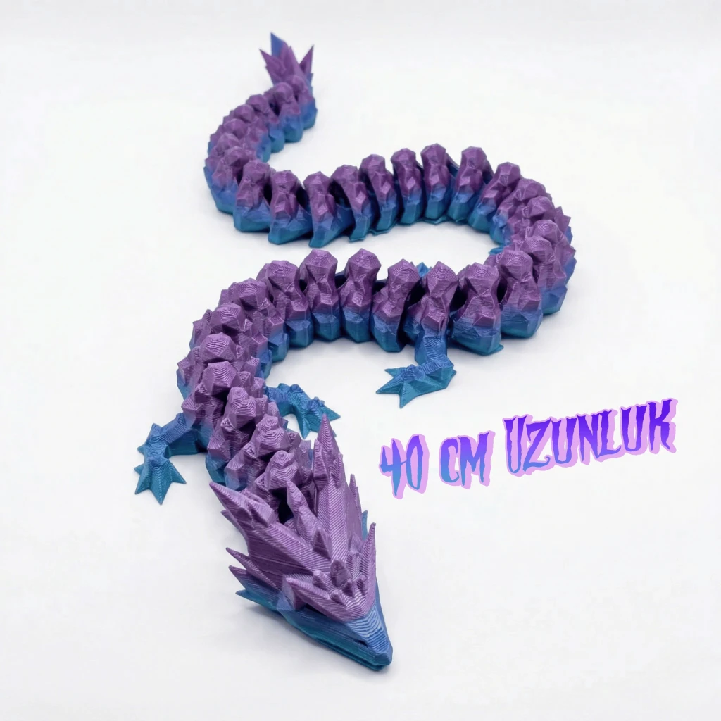 Üstün 3D baskı teknolojisi ile üretilen bu figür, tam 40 cm uzunluğundadır ve birbirine bağlı, tamamen esnek eklem yapısı sayesinde son derece akıcı bir hareket kabiliyetine sahiptir. Elde tutması, hareket ettirmesi ve masanızda sergilemesi inanılmaz keyifli bir deneyim sunar. Kullanılan yüksek kaliteli ipeksi (silk) malzemenin sunduğu büyüleyici renk geçişleri, ejderhaya her açıdan farklı ve dikkat çekici bir görünüm kazandırır.
