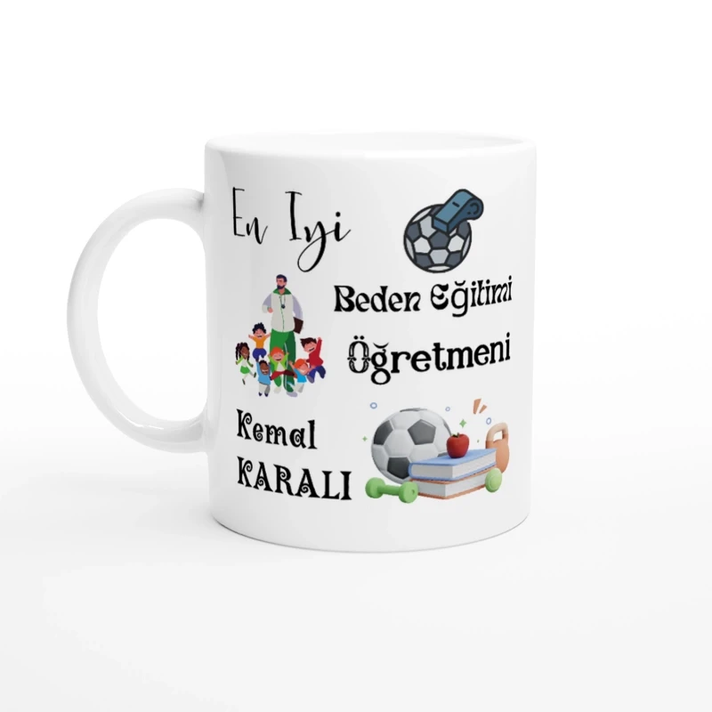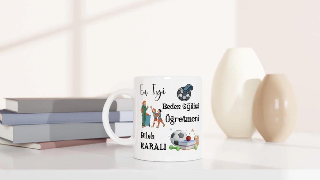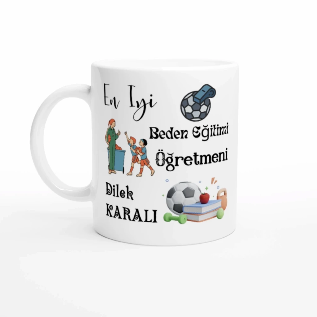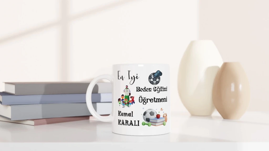 Beden eğitimi öğretmenine özel olarak hazırlanan bu porselen kupa bardak, kişiye özel isim baskısıyla tamamen benzersizdir.