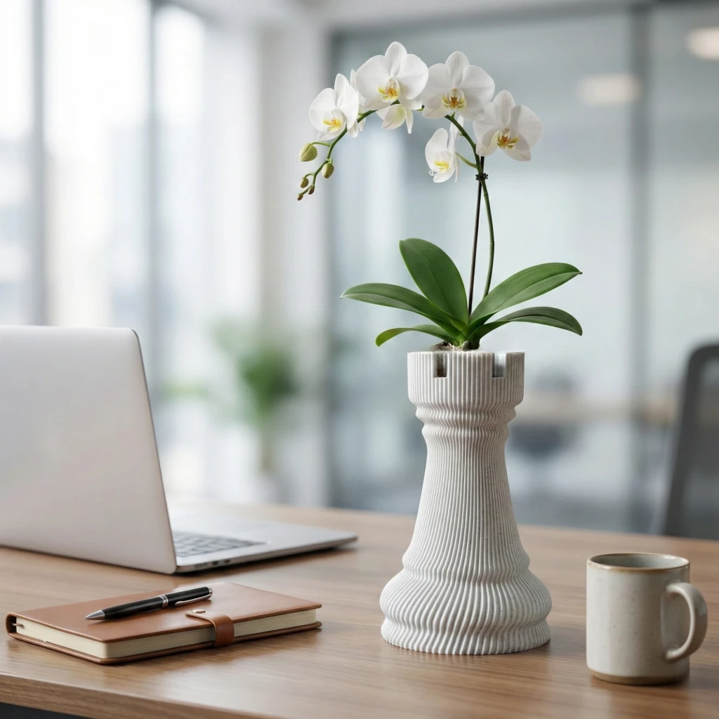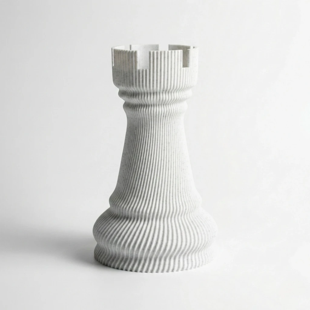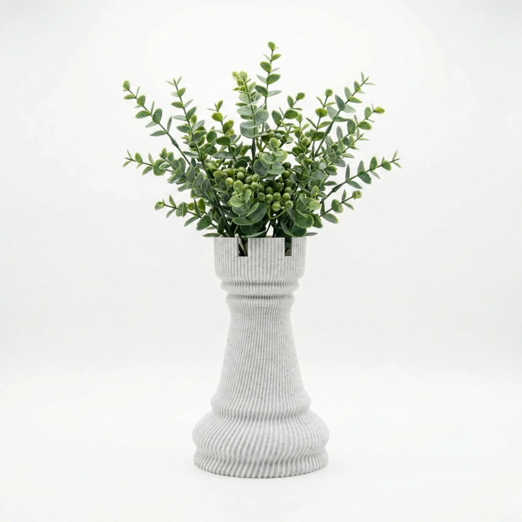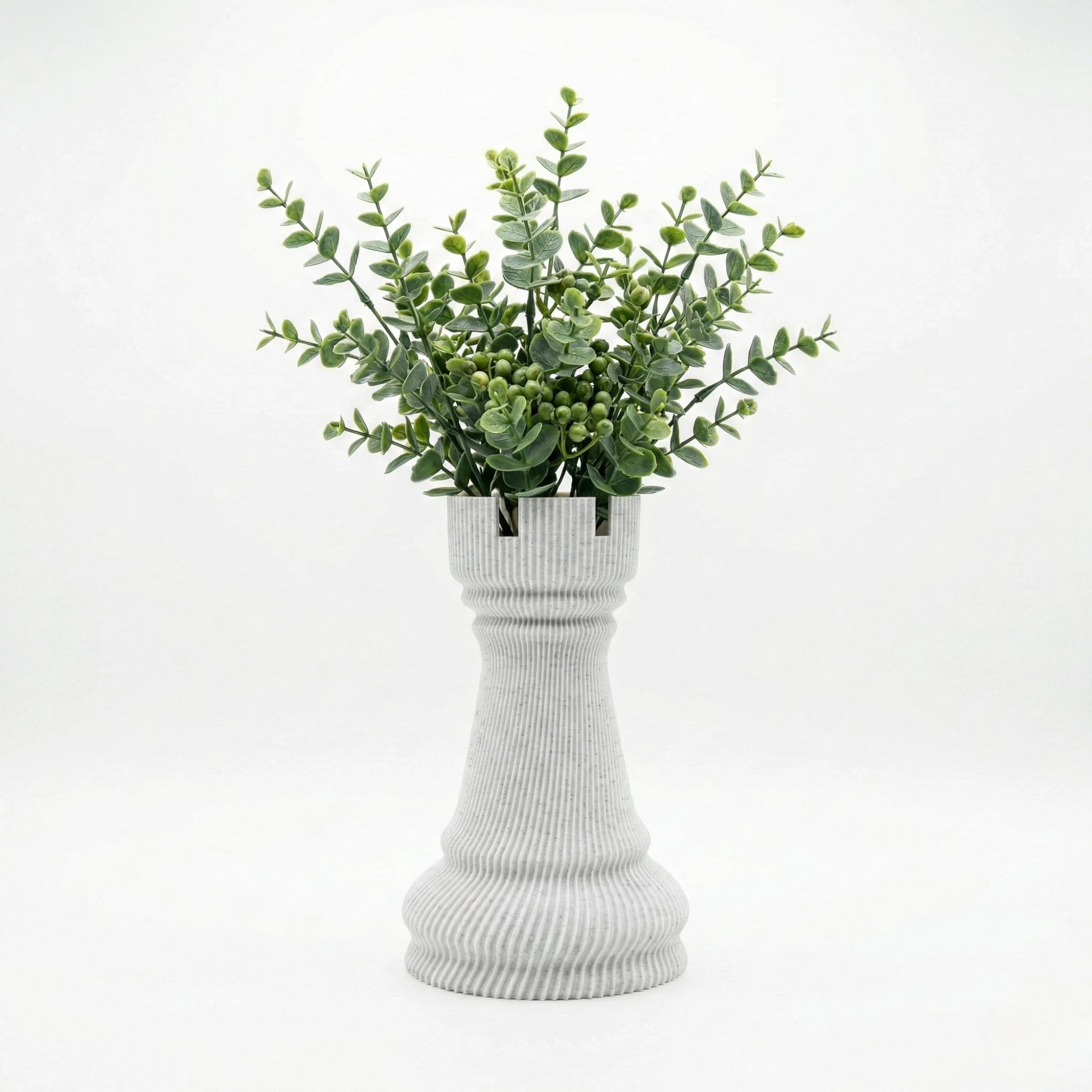 Beyaz Mermer Dokulu Kale Tasarımlı Dekoratif Vazo ve Saksı - Modern Spiral 3D Tasarım (18x11 cm) Ürün Kısa AçıklamasıYaşam alanlarınıza sofistike bir dokunuş katın. Gerçekçi mermer efektine sahip bu özel tasarım vazo, satranç kalesi formundaki güçlü silüeti ve zarif spiral detaylarıyla dikkat çeker. 18 cm yüksekliğindeki bu çok amaçlı parça, ister yapay çiçekleriniz için vazo, ister modern bir saksı, isterseniz de masaüstü düzenleyici olarak kullanıma uygundur. Ürün AçıklamasıModern Tasarımın Zarafeti: Mermer Dokulu Spiral Vazo Ev ve ofis dekorasyonunda fark yaratan detaylar arayanlar için tasarlanan bu ürün, klasik mermer görünümünü çağdaş 3D baskı teknolojisiyle buluşturuyor. Yüzeyindeki ince, dikey spiral oluklar ışıkla etkileşime girerek ürüne derinlik katar ve her açıdan estetik bir görünüm sunar. Öne Çıkan Özellikler: Eşsiz Tasarım: Satranç taşından ilham alan "Kale" formu, güç ve estetiği simgelerken, dikey dalgalı yüzey dokusu modern bir sanat eseri havası yaratır. Gerçekçi Doku: Beyaz üzerine gri benekli mermer efektli PLA malzeme, doğal taşın soğuk ve ağır hissiyatını vermeden aynı görsel zenginliği sağlar. Çok Yönlü Kullanım: Geniş iç hacmi sayesinde kurutulmuş bitkiler, yapay çiçek aranjmanları (örneğin okaliptüs veya orkide) veya sukulentler için saksı olarak kullanılabilir. Ayrıca çalışma masanızda şık bir kalemlik olarak da değerlendirilebilir. Dayanıklı Malzeme: Çevre dostu, sağlığa zararsız ve sert yapılı PLA materyalden yüksek kalite standartlarında üretilmiştir.