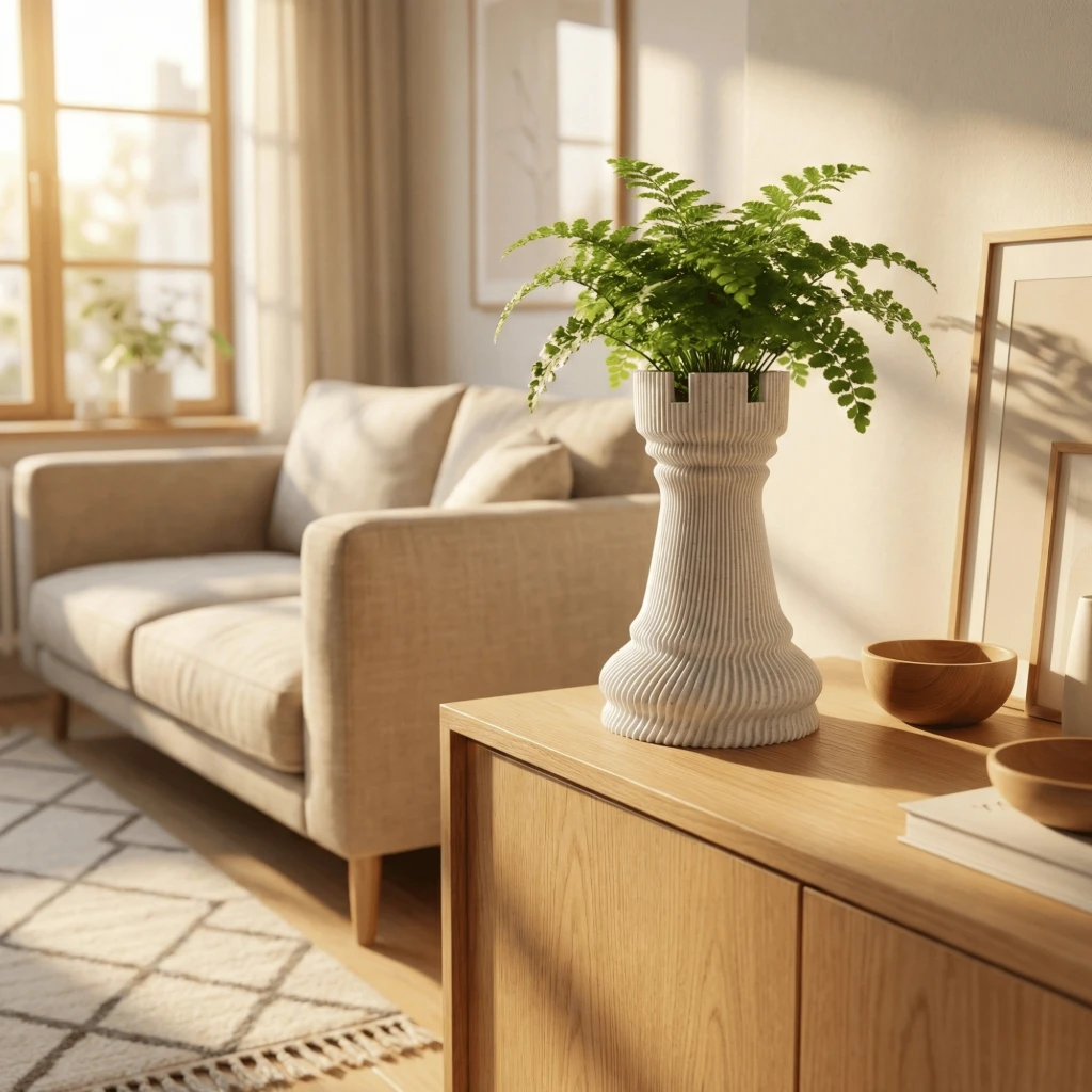 Çok Yönlü Kullanım: Sukulentler, küçük kaktüsler veya tek dal yapay bitkiler (örneğin okaliptüs veya pampas) ile harika bir uyum yakalar. Çiçeksiz olarak tek başına kullanıldığında bile güçlü bir heykelimsi duruş sergiler.