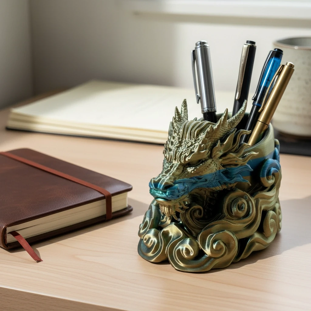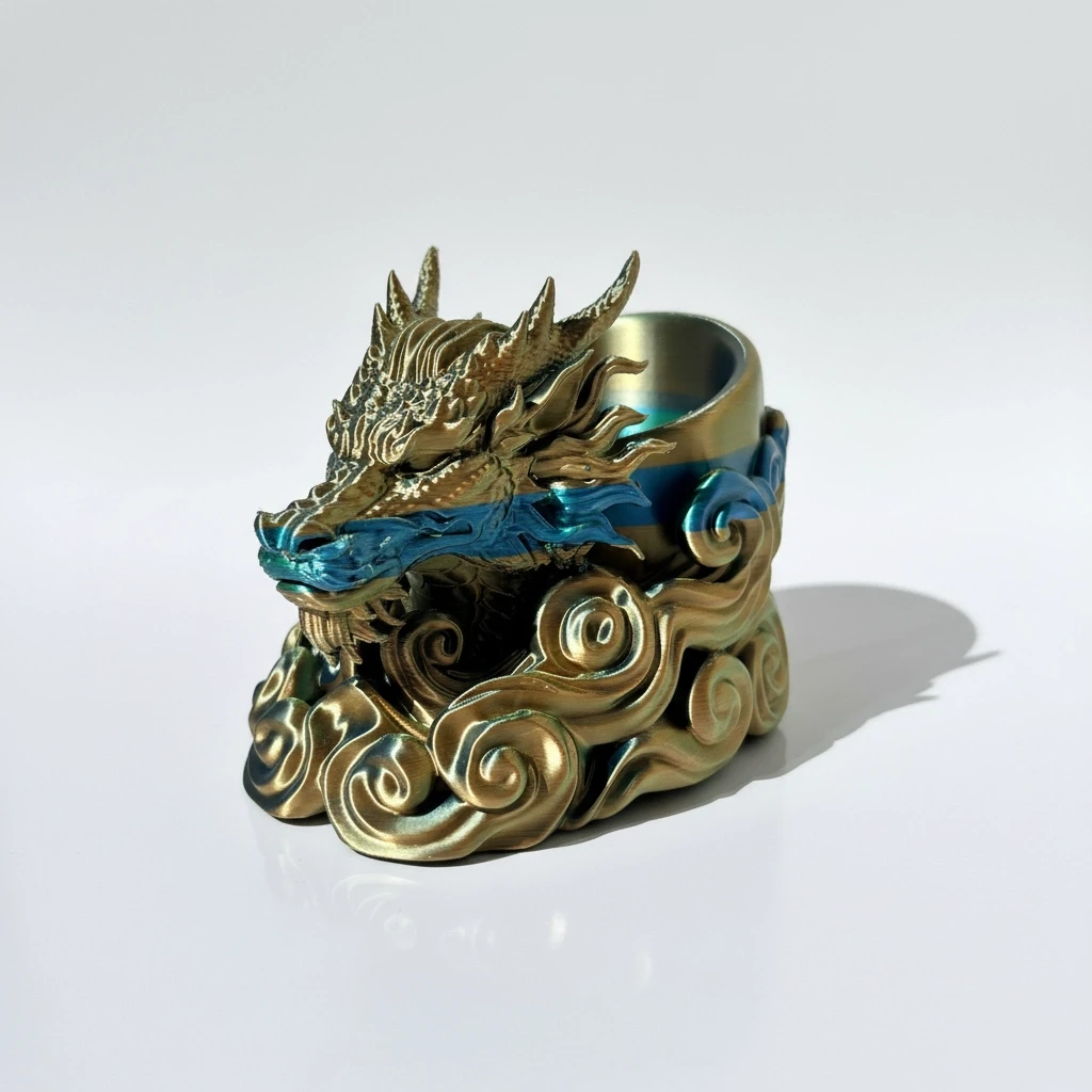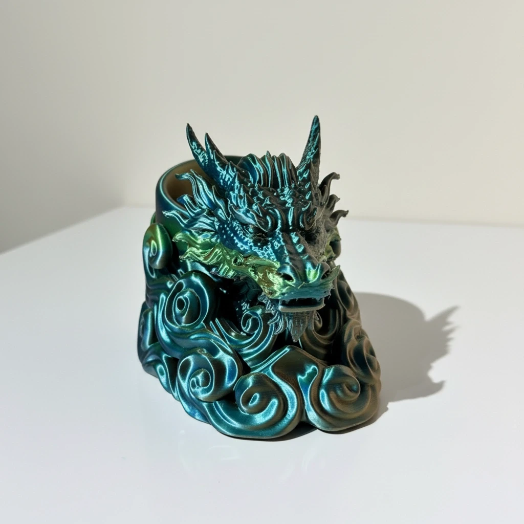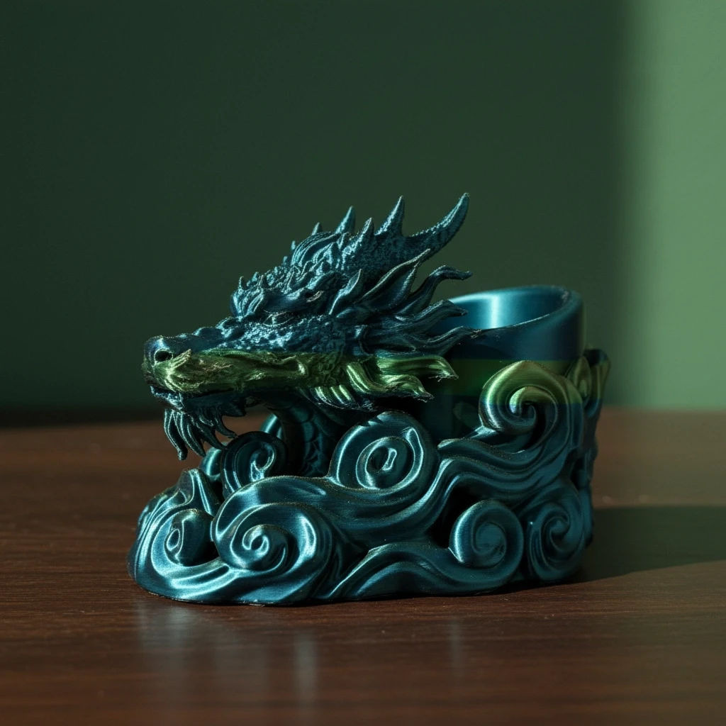 Özel üretim tekniği sayesinde bu benzersiz kalemlik, sabit bir renge sahip değildir. Işığın vuruşuna ve baktığınız açıya göre sürekli değişen renkleriyle adeta canlanır; yeşil, mavi ve bronz tonlarının eşsiz dansını sergiler. Ejderhanın ince detaylarla işlenmiş yüzü ve etrafını saran mistik bulut figürleri, masalara güçlü ve asil bir duruş katar.
