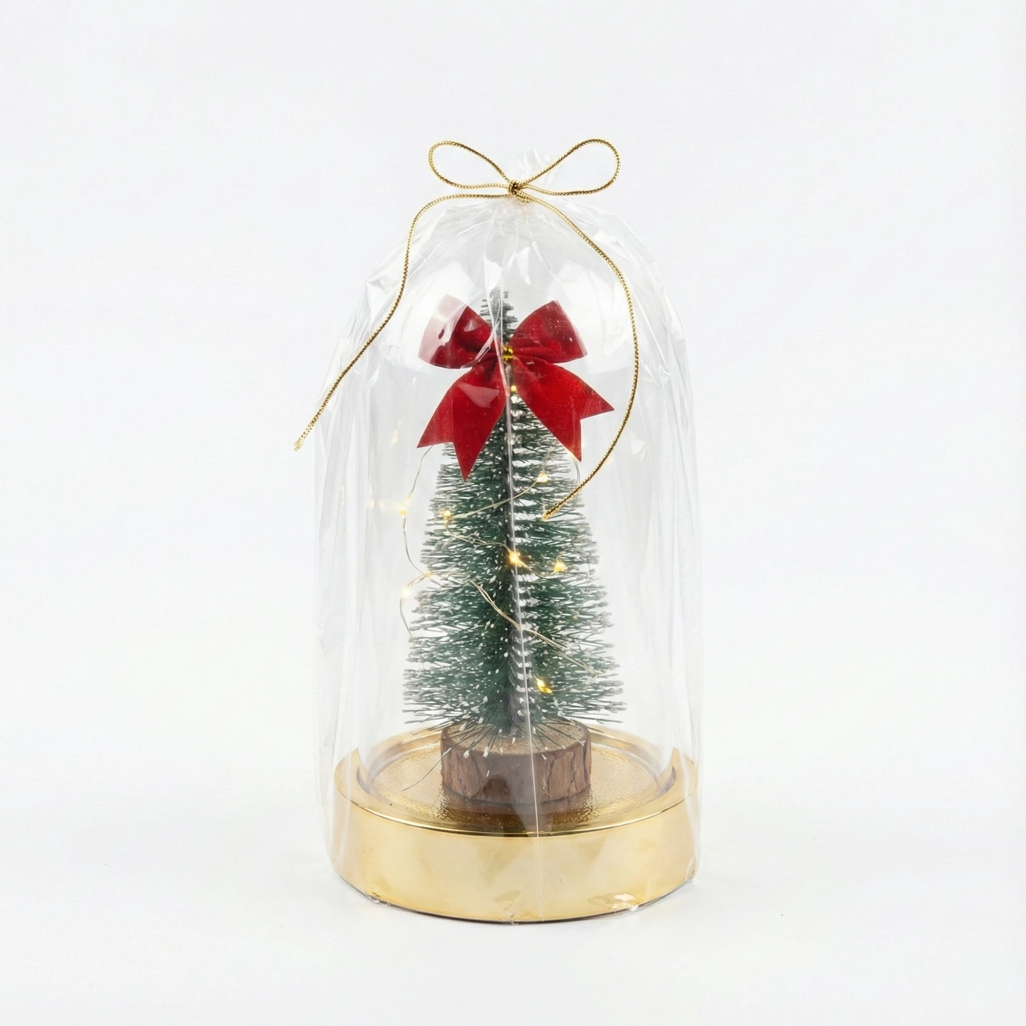 Altın renkli parlak tabanı ve fanus içindeki doğal ahşap görünümlü ağaç standı ile premium bir hediye seçeneğidir. İster kendi evinizde yılbaşı köşesi oluşturun, ister sevdiklerinize kalıcı bir yeni yıl hatırası bırakın.