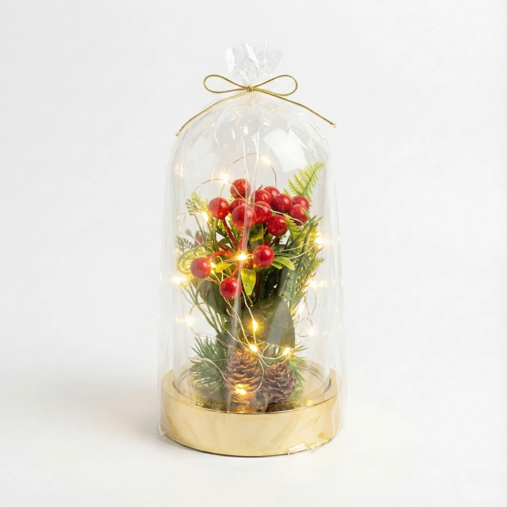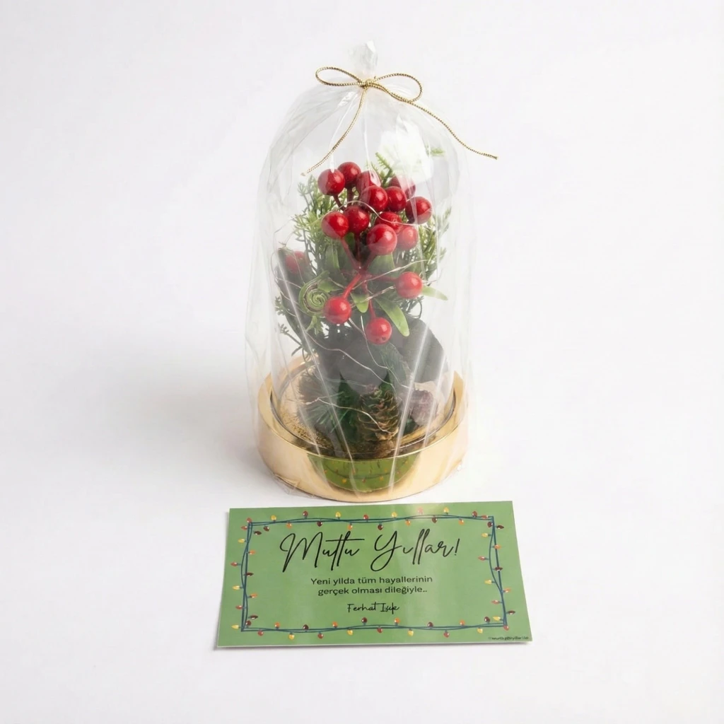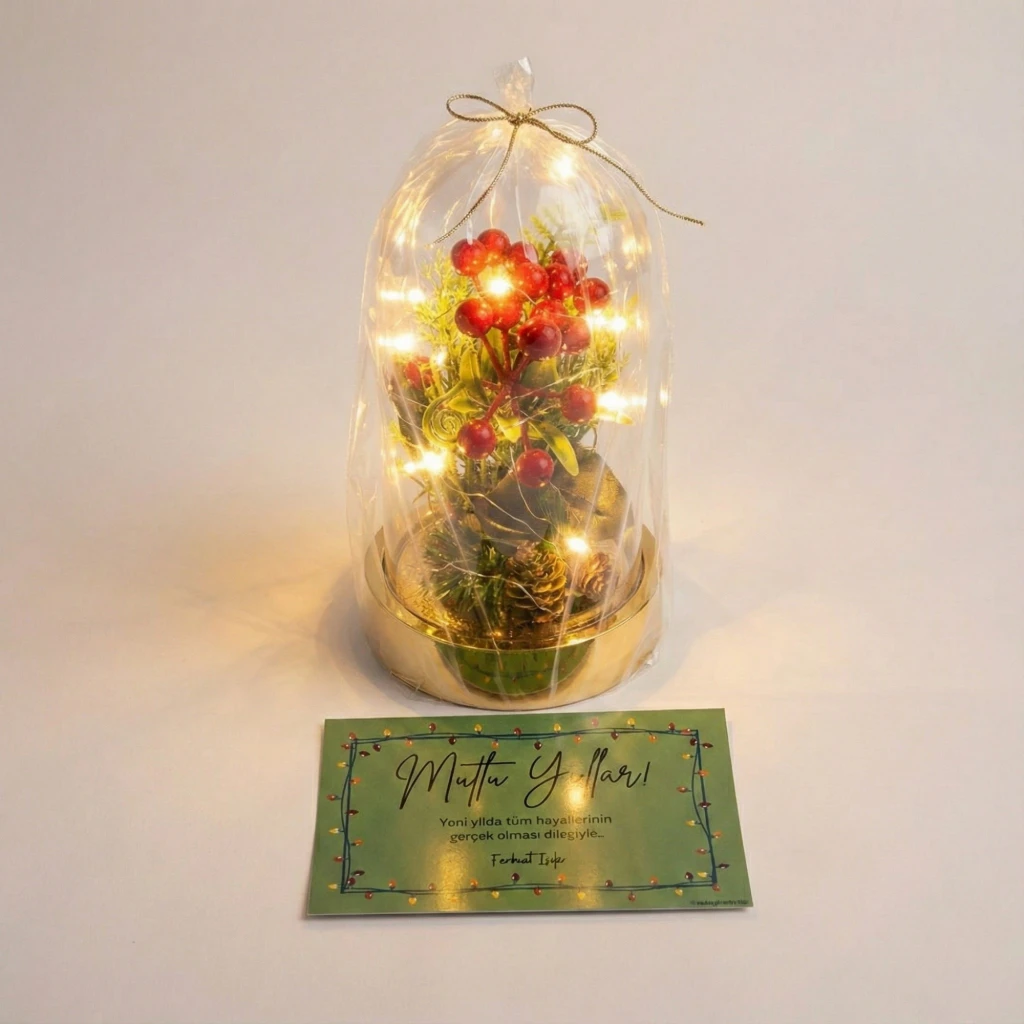 Gold detaylı şık tabanı, içerisindeki doğal görünümlü çam kozalakları, yeşil yapraklar ve canlı kırmızı kokina meyveleriyle bu fanus, sadece bir obje değil, aynı zamanda dekoratif bir gece lambasıdır.