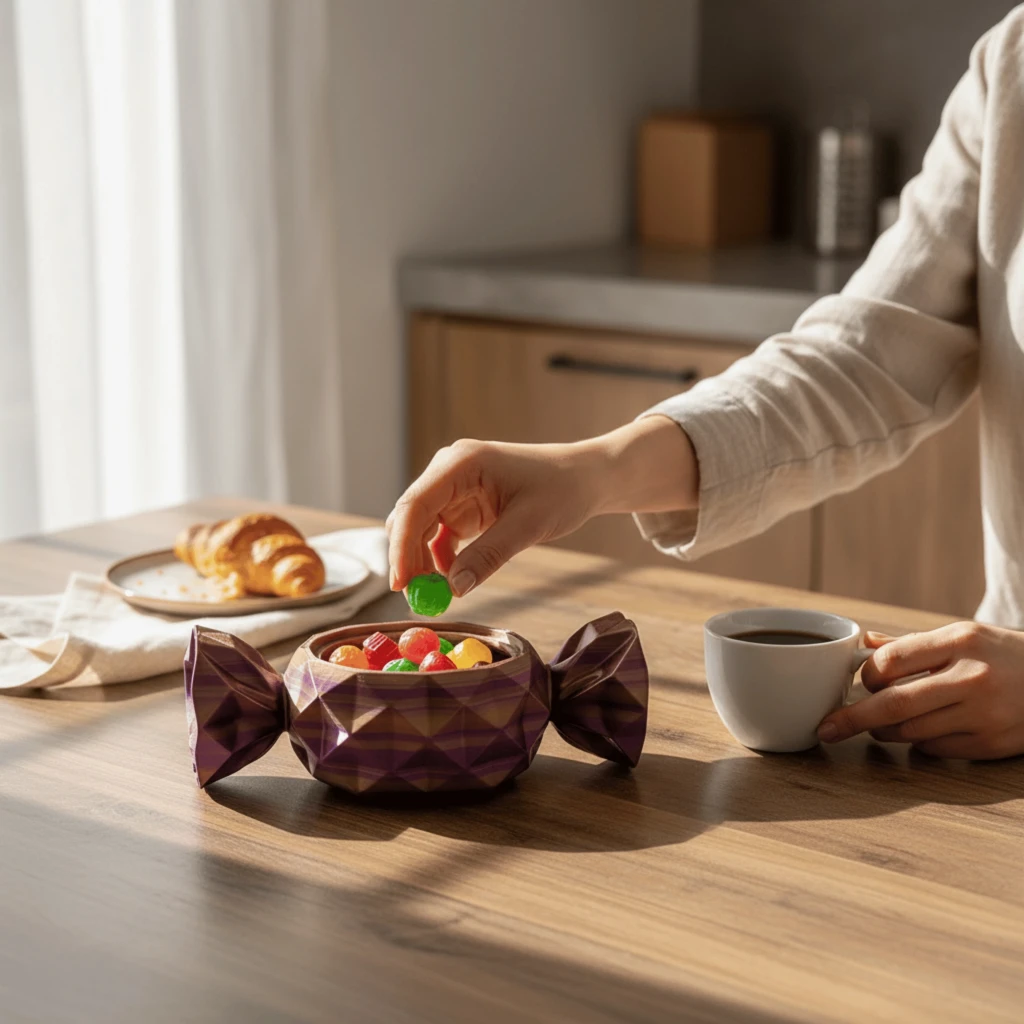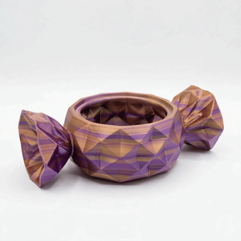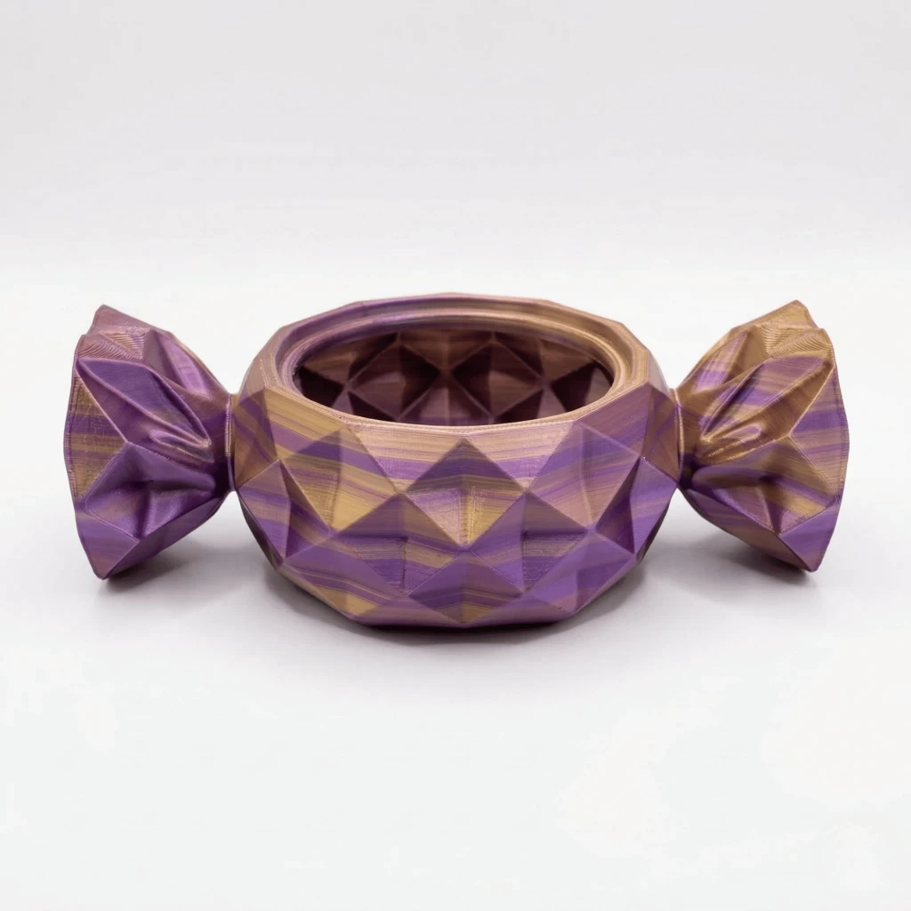 Klasik şeker ambalajı formunun modern, prizmatik hatlarla baştan yaratıldığı bu benzersiz tasarım, dekorasyonunuza iddialı bir dokunuş yapacak. Çift renkli (mor ve altın/bronz) özel ipeksi dokusu sayesinde, ışığın vurduğu açıya göre renk değiştirerek bulunduğu ortama dinamik bir hava katar. Geometrik elmas deseni, kaseye her bakışta farklı bir derinlik ve şıklık sunar.