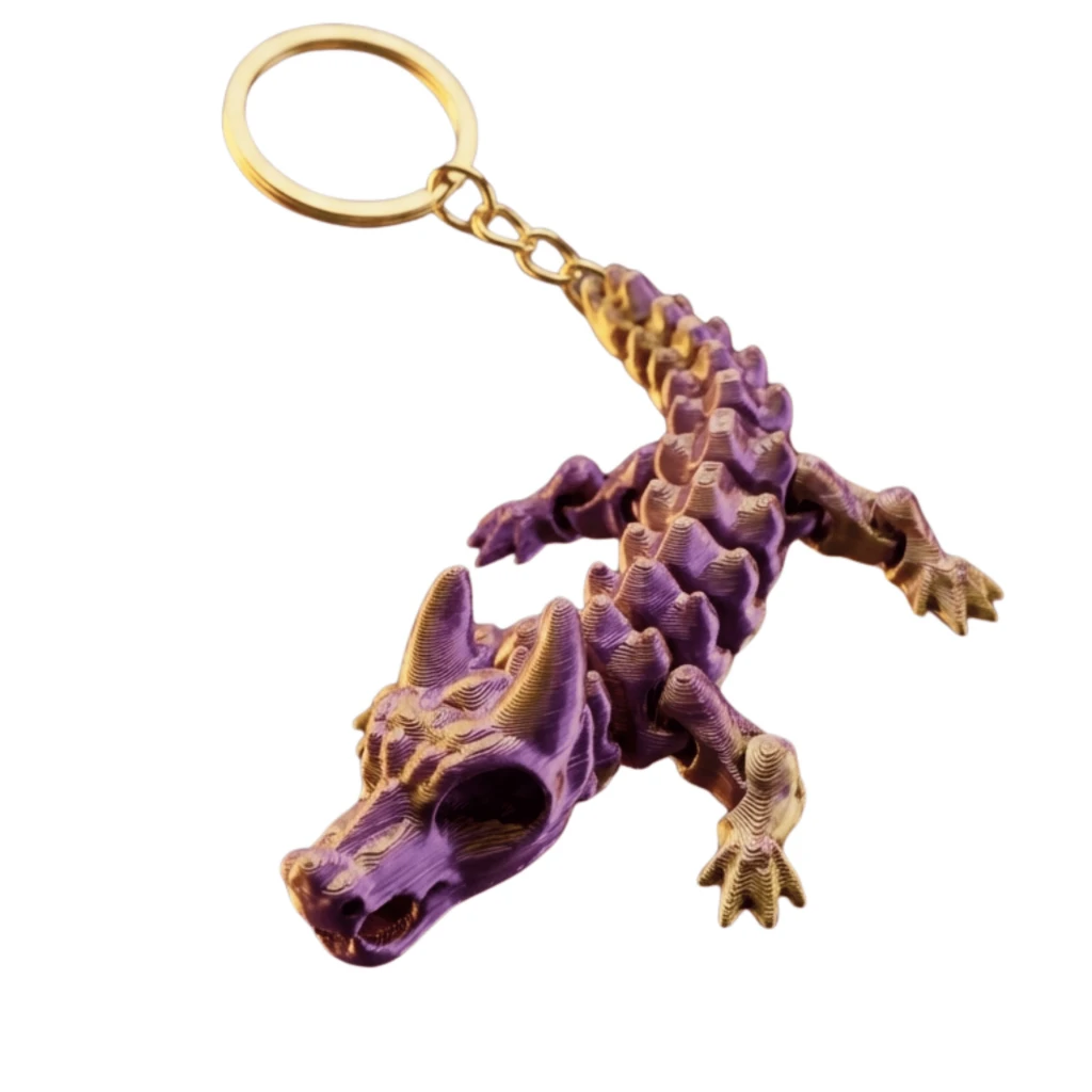 Sıradanlıktan kurtulun ve anahtarlarınızı bir efsanenin parçasıyla süsleyin. Karşınızda, detaylı 3D baskı işçiliğiyle hayat bulan, metalik mor ve altın tonlarında büyüleyici bir eklemli ejderha kafatası anahtarlık.