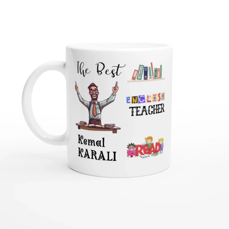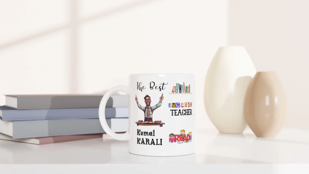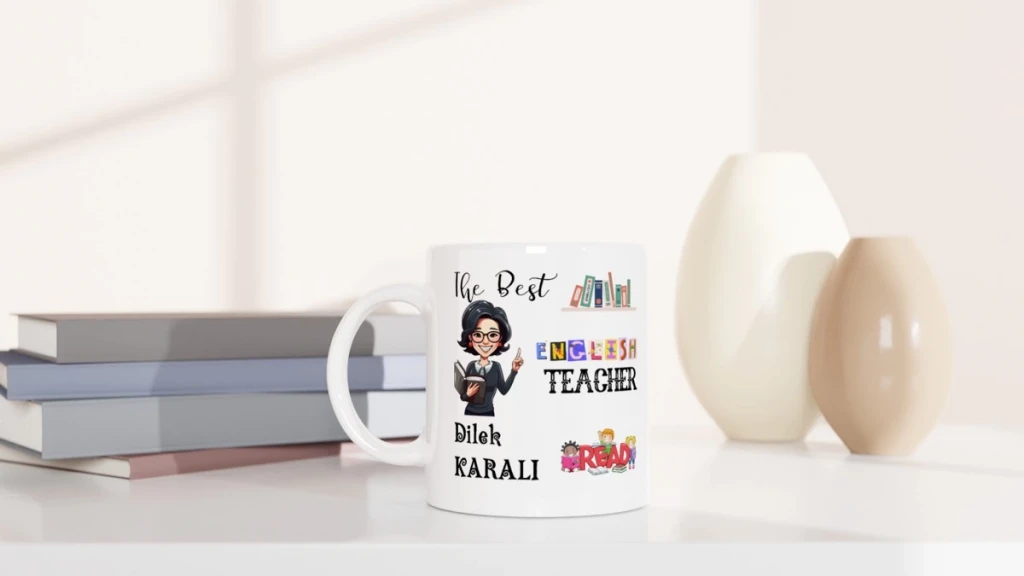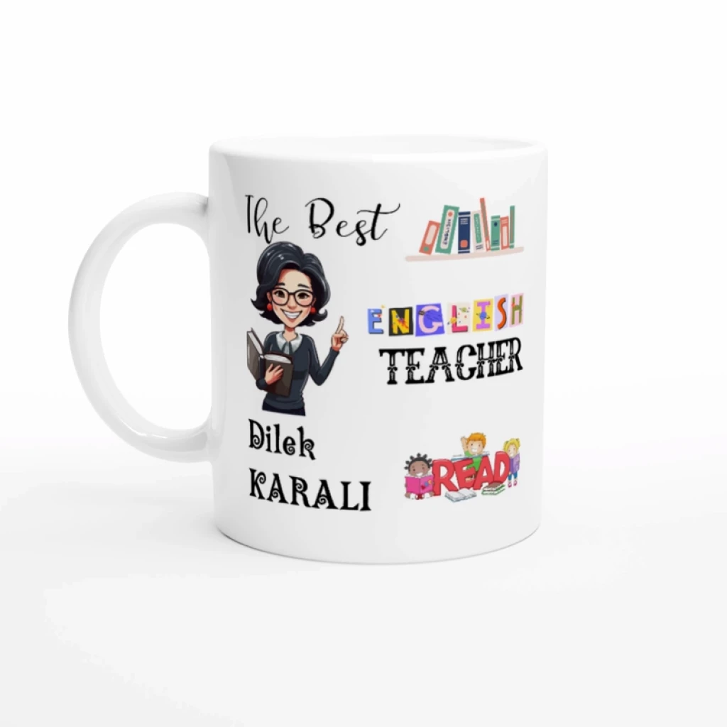 İngilizce öğretmeninizin ismine özel olarak hazırlanan porselen kupa bardak, çift taraf baskılı tasarımıyla dikkat çeker.