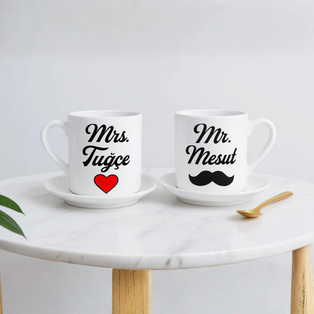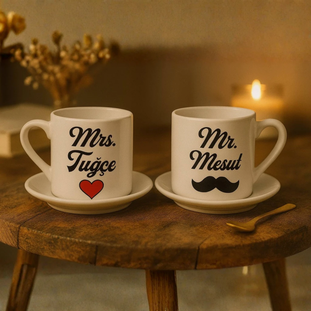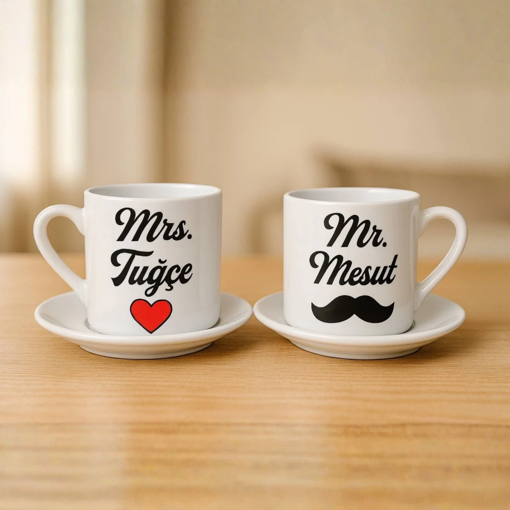 Set içeriği: 2 adet kişiye özel porselen fincan + 2 adet porselen tabak