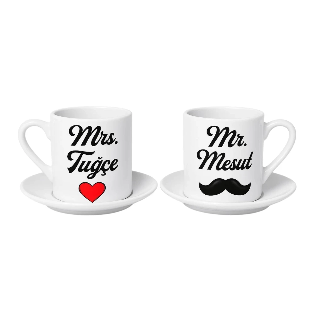 Kişiye özel isim baskılı bu zarif porselen kahve fincanı seti, sevdiğinle paylaştığın en güzel anlara eşlik eder.