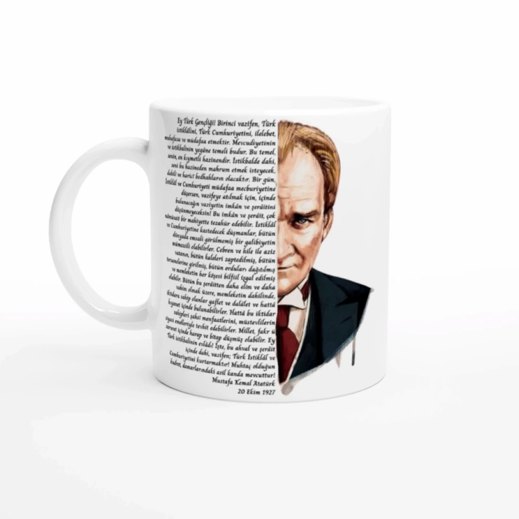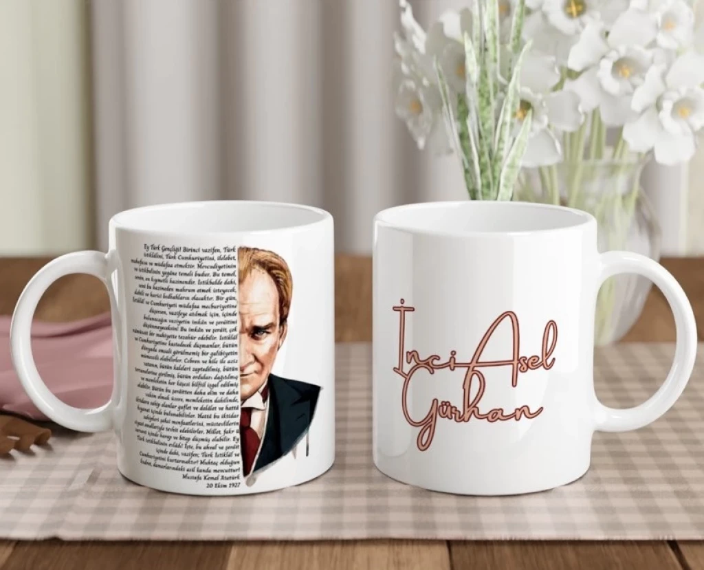 Bu özel porselen kupa, bir yanında Atatürk’ün Gençliğe Hitabesi ve diğer yanında kişiye özel isim baskısı ile hem anlamlı hem de zarif bir tasarıma sahiptir.