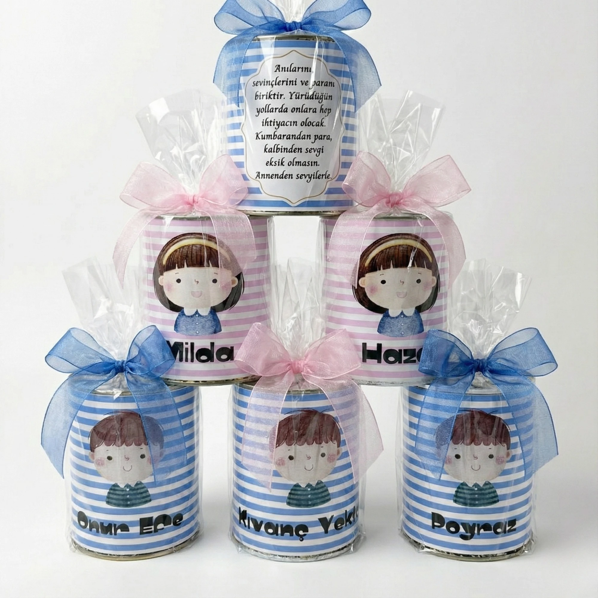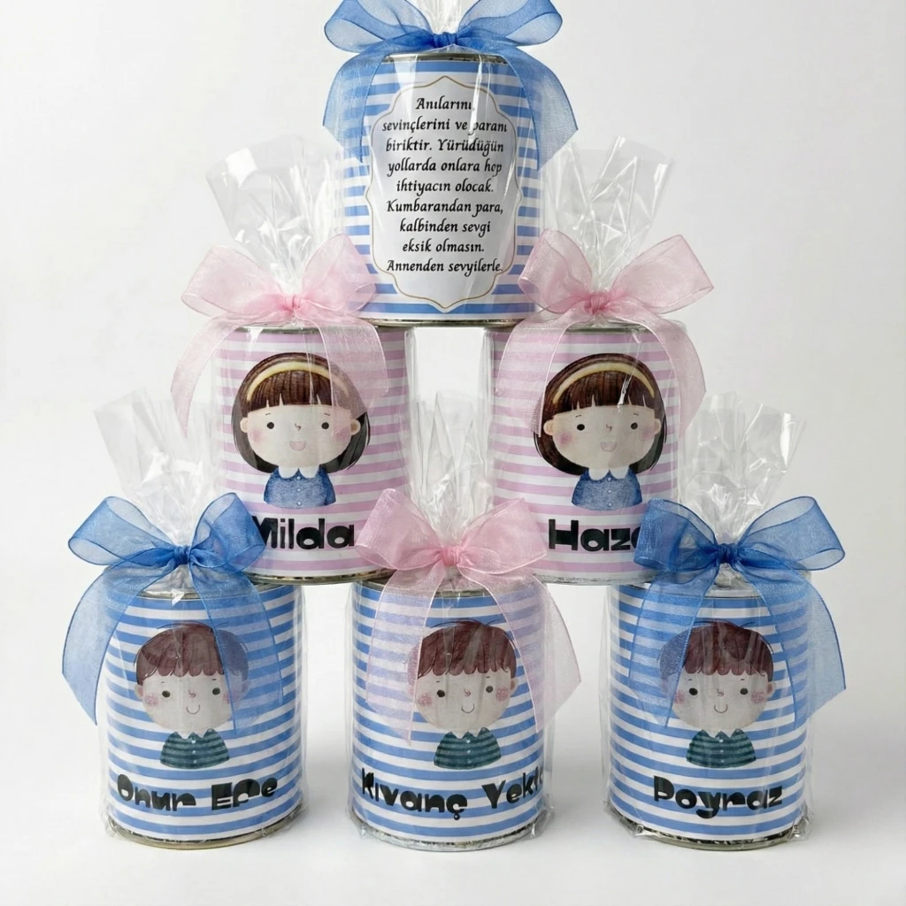Ürünümüz sadece bir kumbara değil, aynı zamanda şık bir hediye seçeneğidir. Özel şeffaf jelatin ambalajı ve tasarıma uygun renkli (mavi/pembe) şifon/organze kurdelesi ile özenle paketlenmiş olarak gönderilir. Ekstra hediye paketi yapmanıza gerek kalmaz.