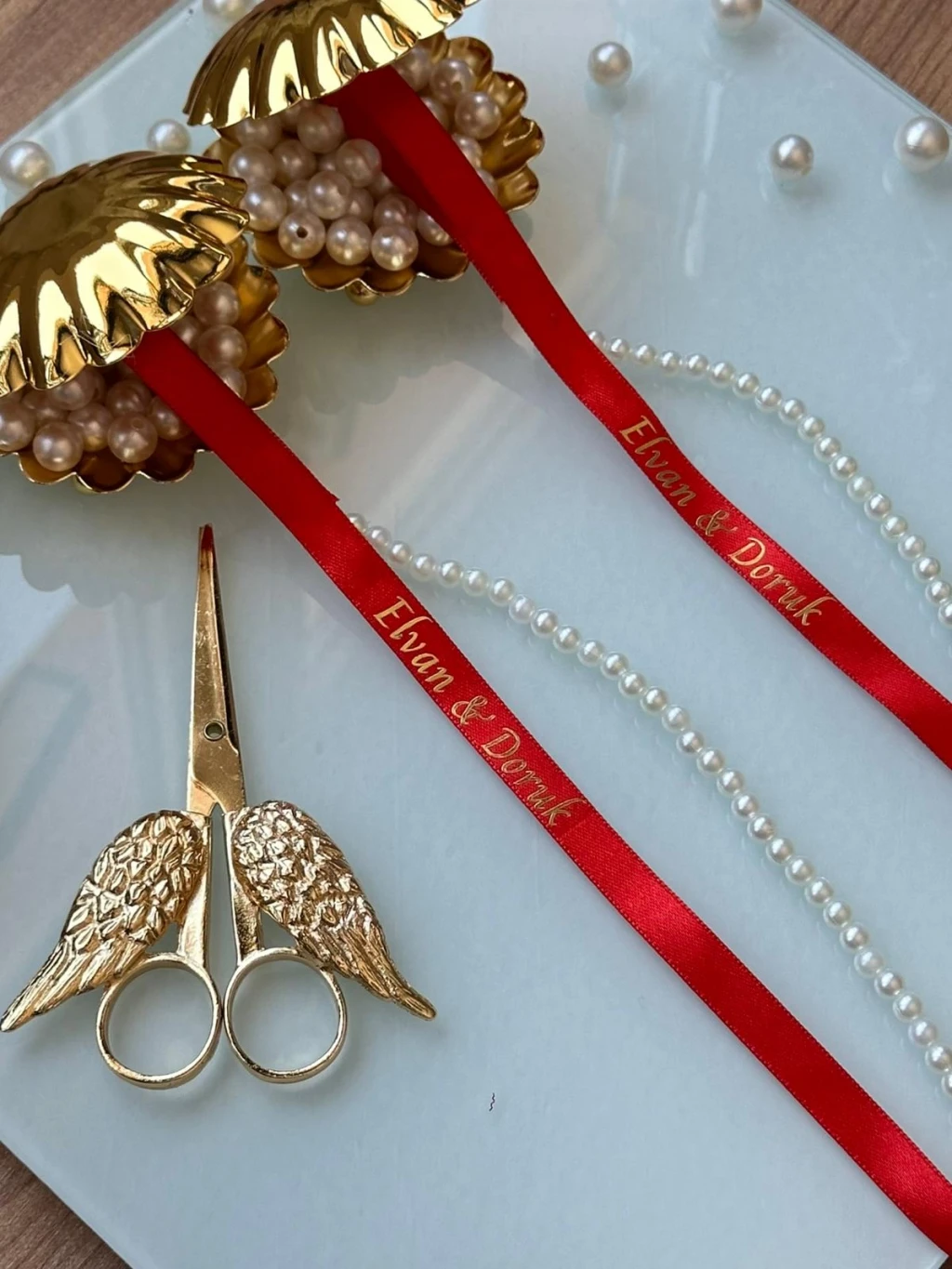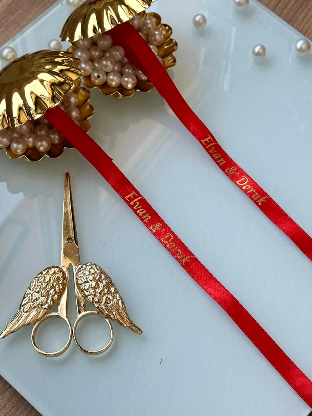 Kırmızı saten dokusuyla şıklığın simgesi olan bu özel söz kurdelesi, kişiye özel isim baskısıyla ömür boyu saklanacak bir hatıra sunar.