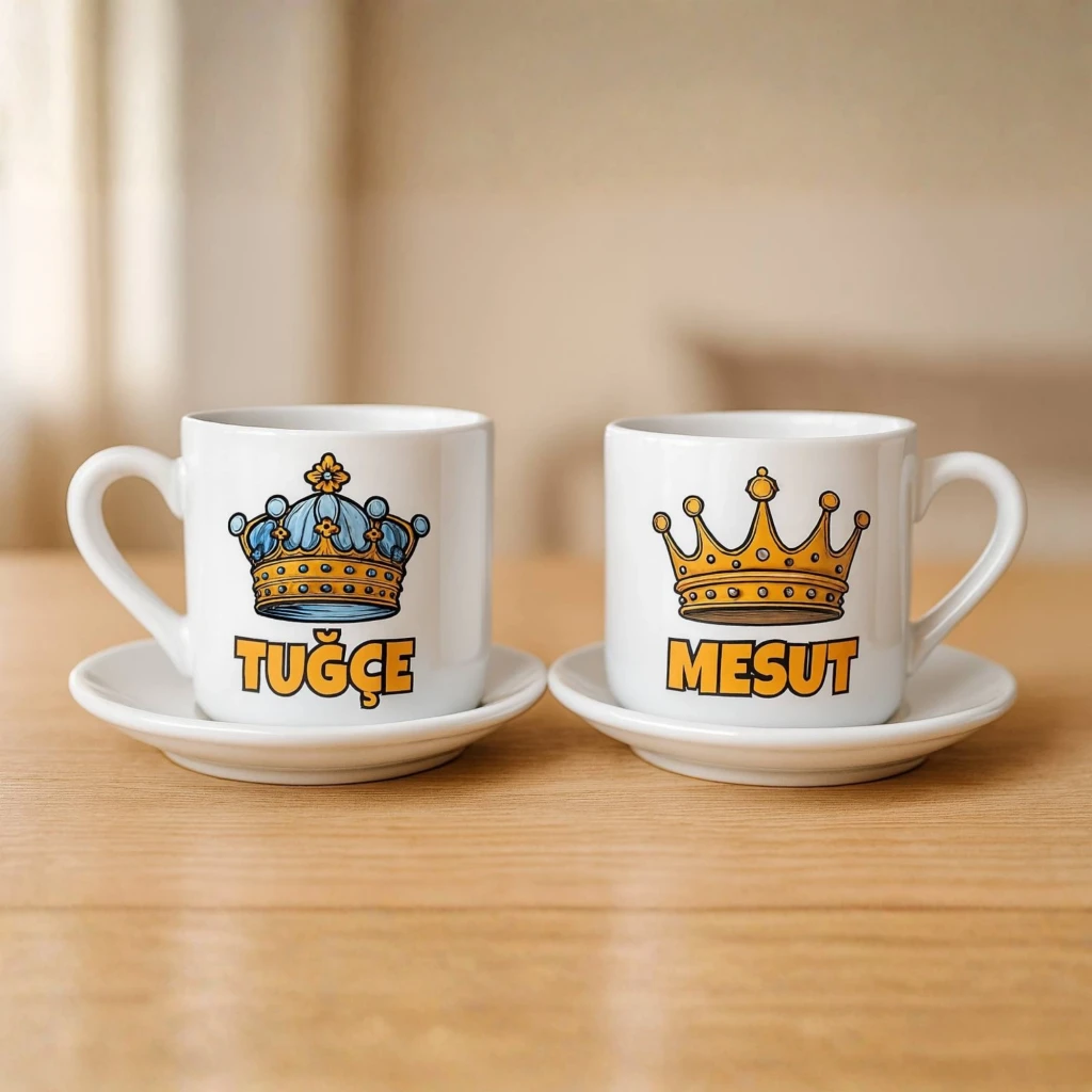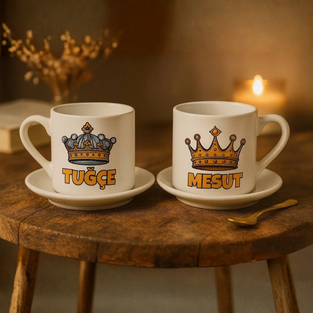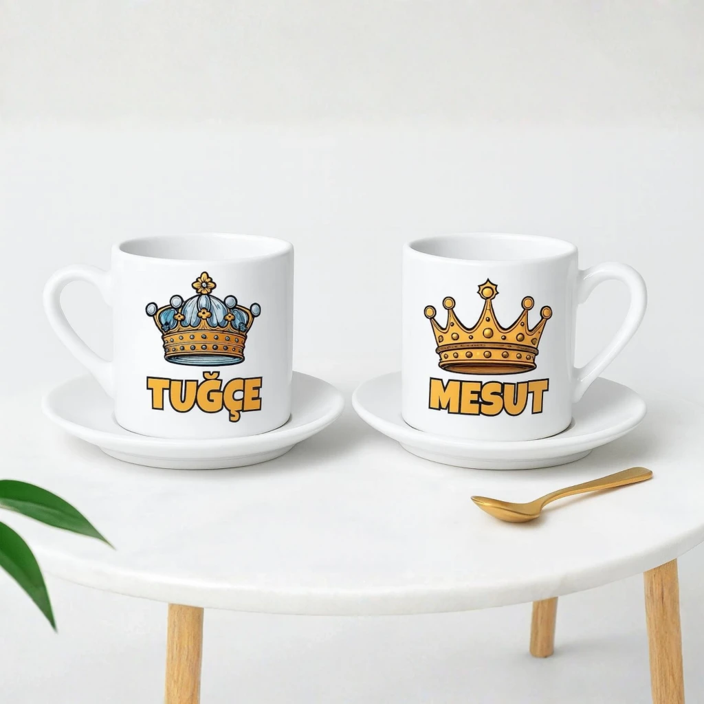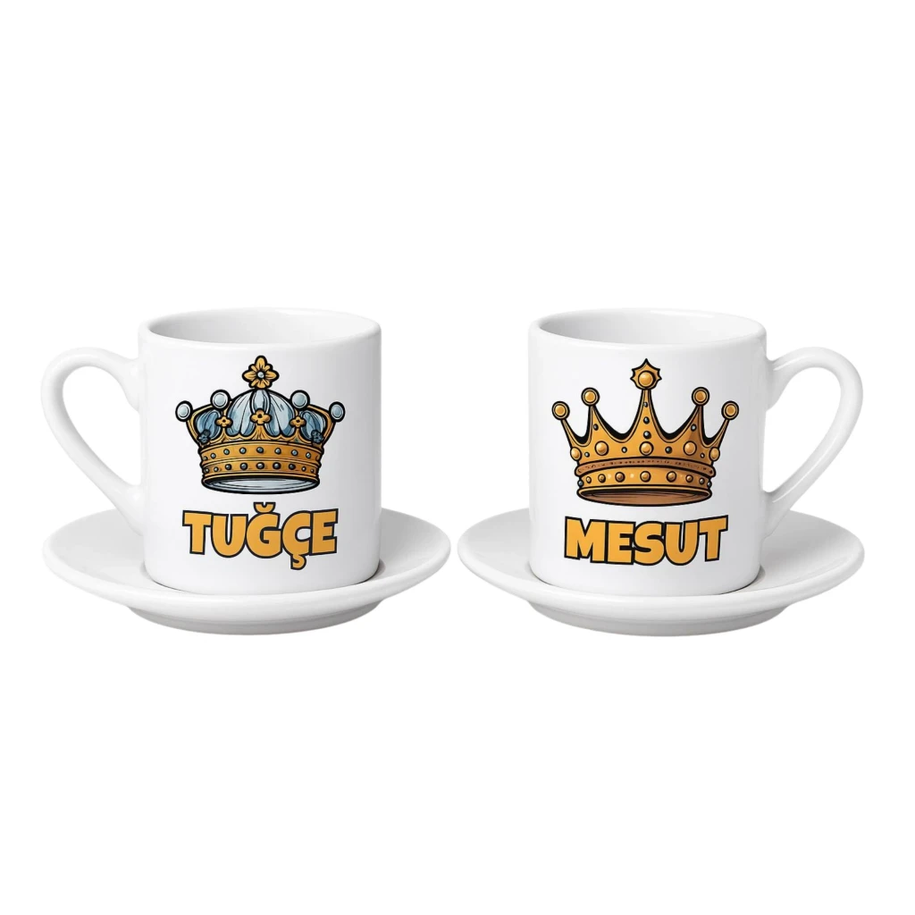 Kişiye özel “Kral & Kraliçe” tasarımlı porselen kahve fincanı seti, sevdiğinizle paylaşacağınız en özel kahve anlarını taçlandırır.