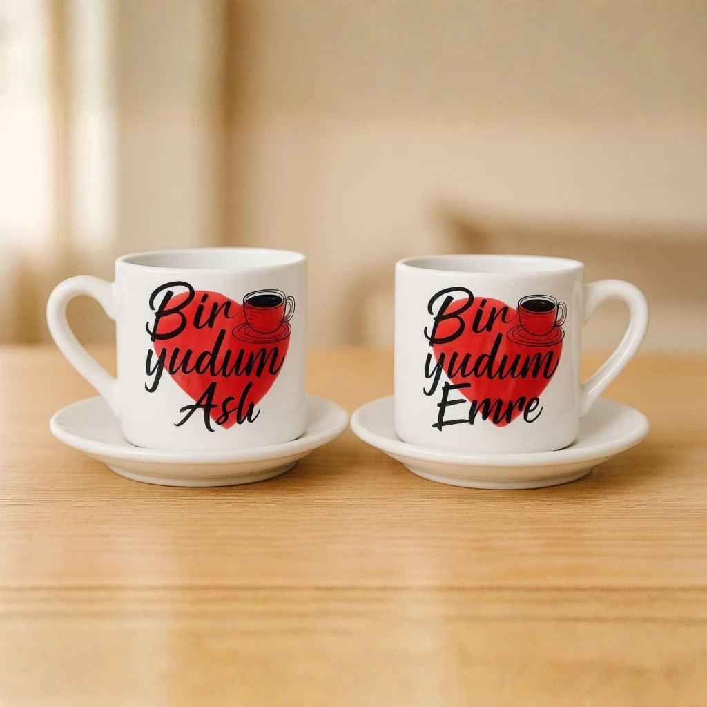 Romantik tasarımıyla dikkat çeken bu kişiye özel fincan seti, “Bir Yudum Aşk” konseptiyle sevdiğinizle paylaştığınız sıcak anların simgesi olur.