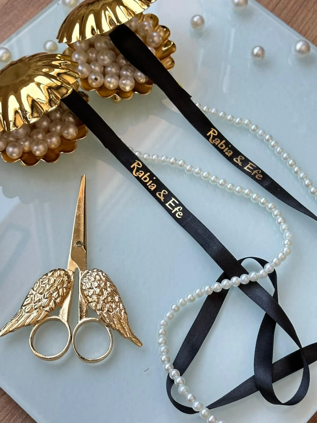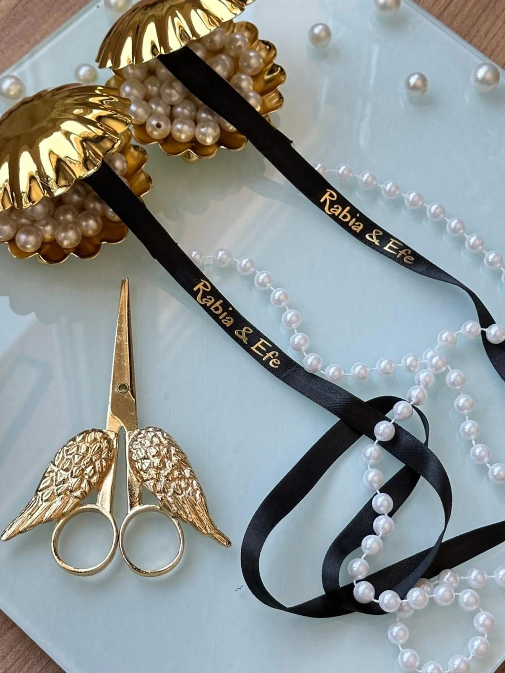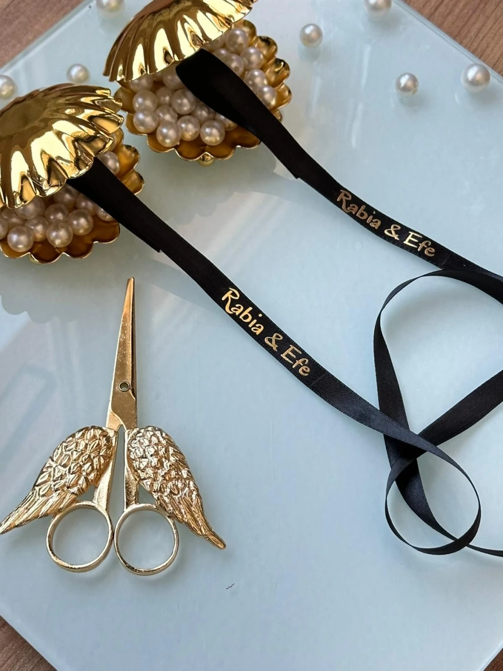 Siyah saten dokusuyla şıklığın simgesi olan bu özel söz kurdelesi, kişiye özel isim baskısıyla ömür boyu saklanacak bir hatıra sunar.