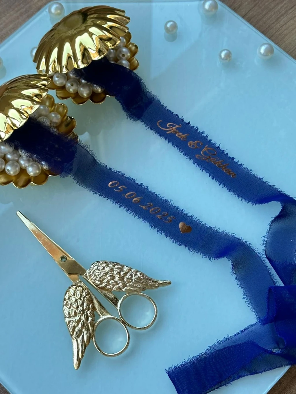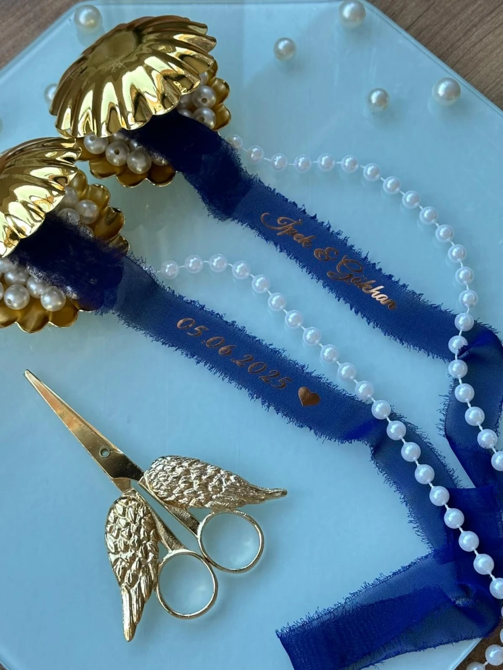 Kişiye özel isim baskılı söz kurdelesi, üç farklı inci seçeneği ile sunuluyor: