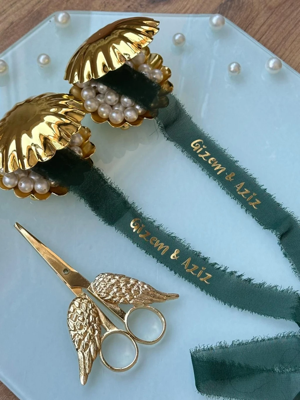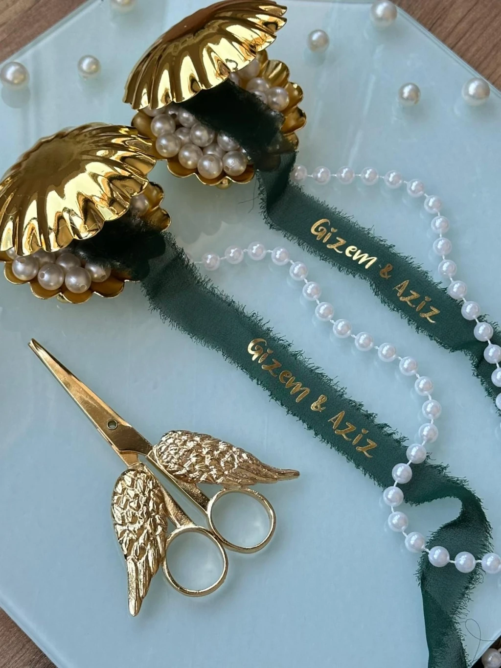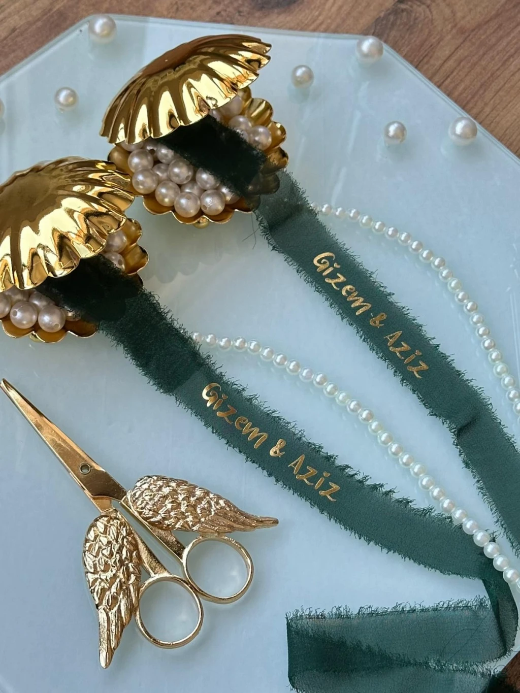 Kişiye özel isim baskılı söz kurdelesi, üç farklı inci seçeneği ile sunuluyor: