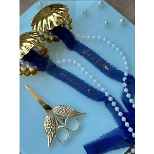 Kişiye Özel Söz Kurdelesi – Sade & İncili & İsim Baskılı Lacivert İpek Kumaş Kurdele