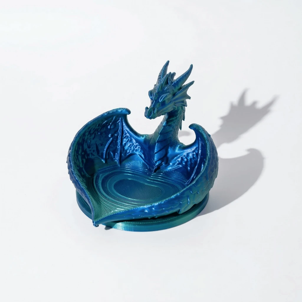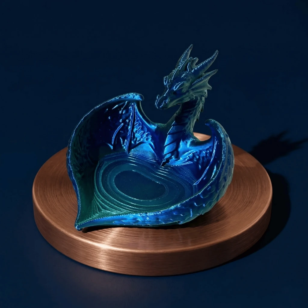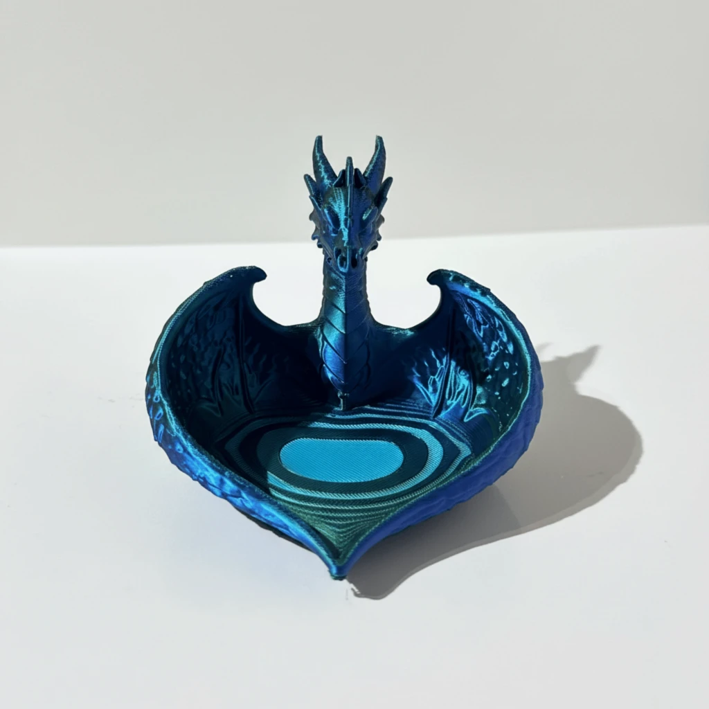 Büyüleyici Çift Renk Efekti: Işığın açısına göre mavi ve yeşil tonları arasında büyüleyici bir geçiş yapan yüksek kaliteli, çift renkli filament kullanılmıştır. Her bir kase, baskı sırasındaki filament akışına bağlı olarak kendine özgü bir renk desenine sahiptir, bu da onu gerçekten eşsiz kılar.