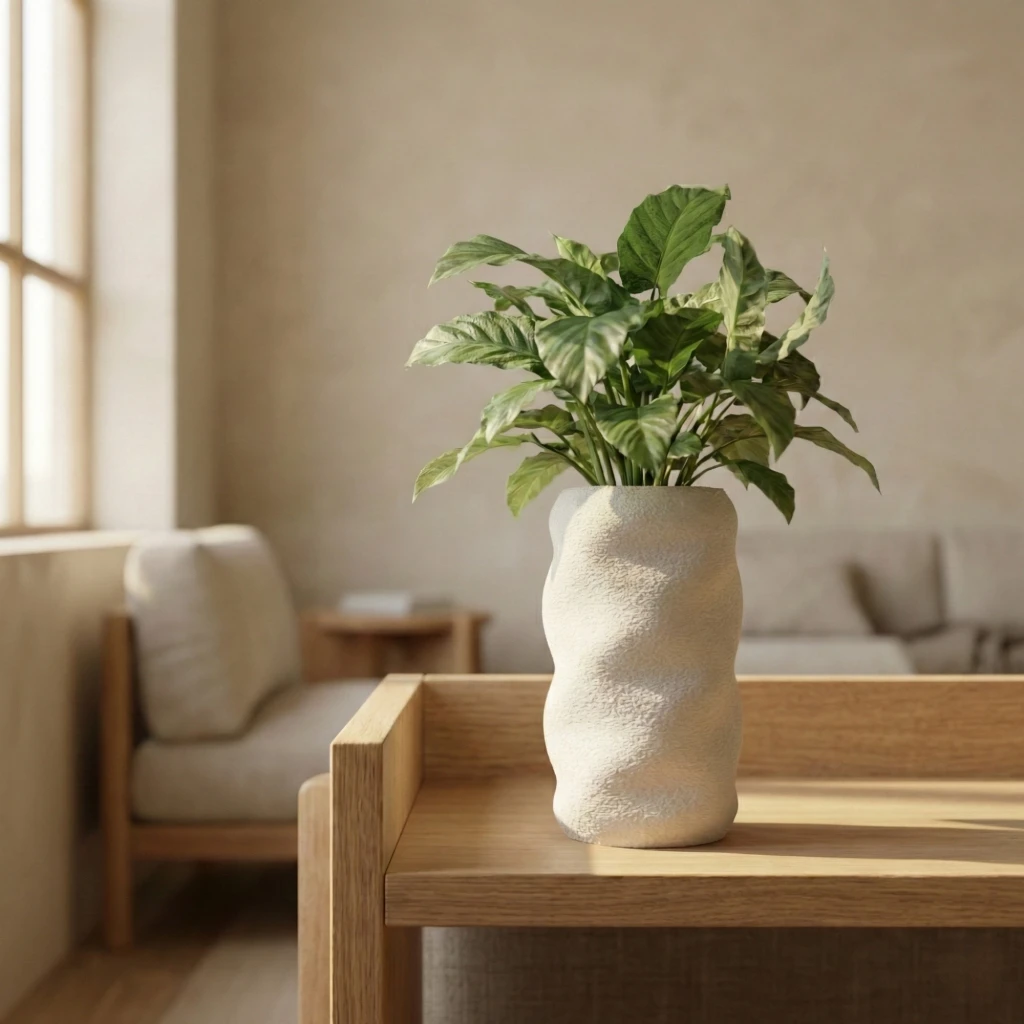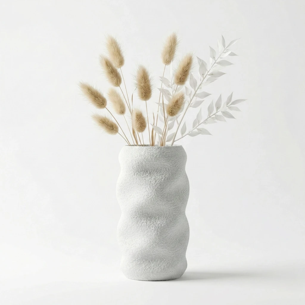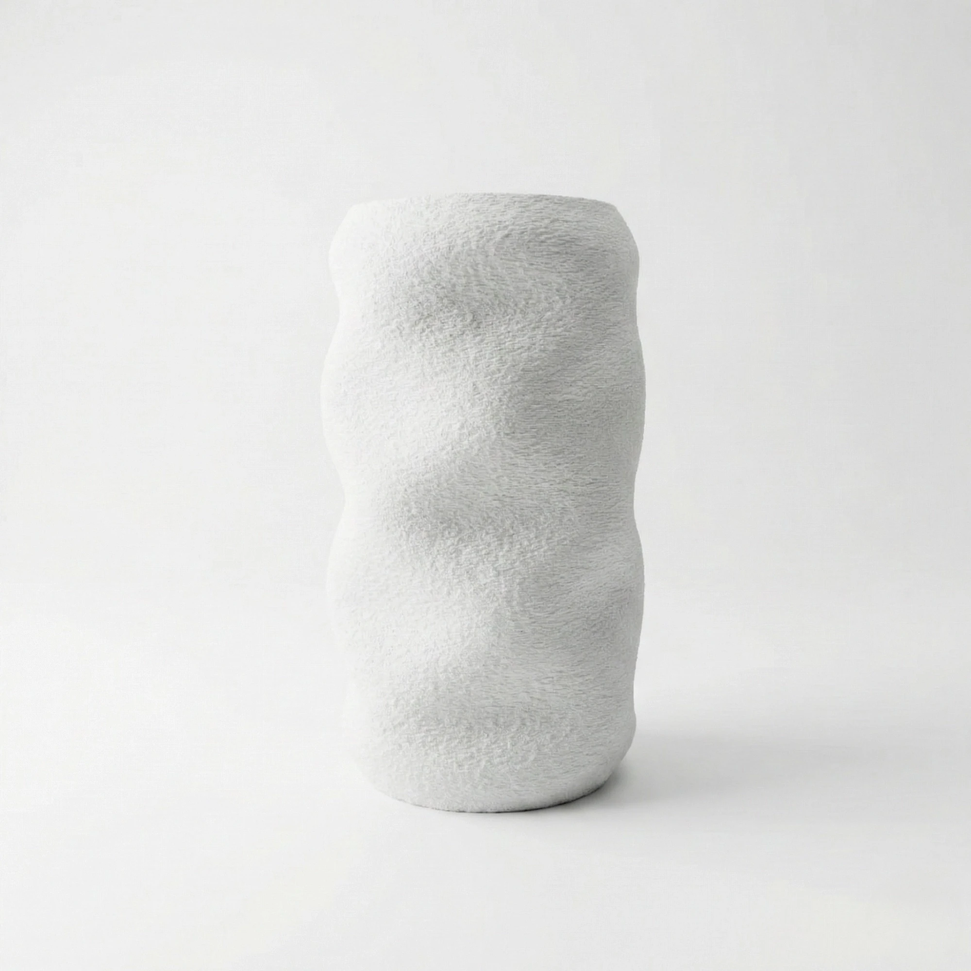Evinizin veya ofisinizin havasını tek bir dokunuşla değiştirin. Bu özel tasarım beyaz vazo, standart dekorasyon ürünlerinden farklılaşan yapısıyla dikkat çekiyor. 3 boyutlu üretim teknolojisinin özel bir tekniği kullanılarak elde edilen "kumtaşı" benzeri pütürlü yüzeyi, ürüne hem doğal bir taş görünümü kazandırıyor hem de mat ve sofistike bir duruş sergiliyor. Minimalist dalgalı formu, ışığın vazo üzerine düştüğünde yumuşak gölgeler oluşturmasını sağlayarak bulunduğu alana derinlik katar. Özellikle modern, bohem ve minimalist iç mekan tasarımlarıyla kusursuz bir uyum yakalar. Kullanım Alanları: Çalışma masanızda kalemlik veya dekoratif bir obje olarak, konsol üzerinde kuru dallarla veya banyonuzda şık bir detay olarak değerlendirebilirsiniz. 16 cm'lik kompakt yüksekliği sayesinde dar raflara ve nişlere rahatlıkla sığar. Teknik Özellikler: Malzeme: Yüksek kaliteli, çevre dostu PLA (Biyobozunur Polimer). Yükseklik: 16 cm Çap: 9 cm Renk: Mat Beyaz Doku: Özel granüllü/kumlu yüzey dokusu. Bakım: Nemli bir bezle silinmesi önerilir. Doğrudan ısı kaynaklarından uzak tutunuz.