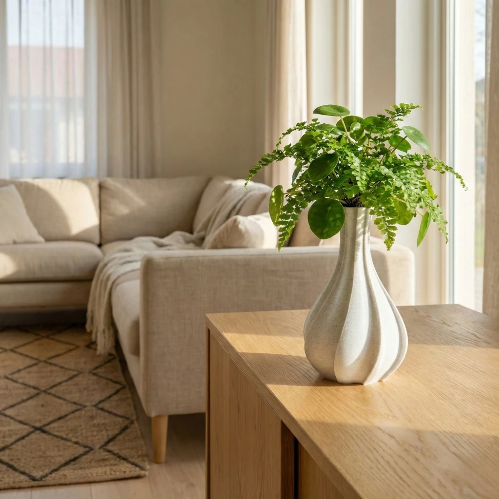 Çok Yönlü Kullanım: Sukulentler, küçük kaktüsler veya tek dal yapay bitkiler (örneğin okaliptüs veya pampas) ile harika bir uyum yakalar. Çiçeksiz olarak tek başına kullanıldığında bile güçlü bir heykelimsi duruş sergiler.