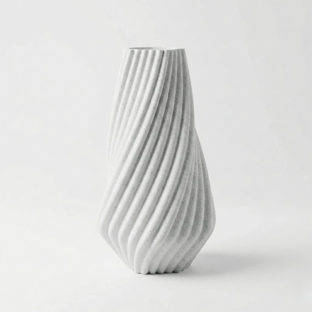 Evinizin Havasını Değiştiren Estetik Dokunuş Sıradan dekorasyon ürünlerinden sıkılanlar için tasarlanan bu özel vazo, akışkan spiral formuyla bulunduğu her ortamda dikkatleri üzerine çeker. Üzerindeki ince mermer partikül efektleri, ürüne doğal bir taş görünümü kazandırırken, kıvrımlı yüzeyi ışık ve gölge oyunları yaratarak derinlik hissi oluşturur. Öne Çıkan Özellikler: Özgün Tasarım: Klasik vazo formunun modern bir yorumu olan burkulan spiral yapı, masanızda veya rafınızda bir sanat eseri gibi durur. Mermer Dokusu: Soğuk beyazın sadeliğini, üzerindeki gri mermer benekleri ile hareketlendirerek doğal ve zengin bir görünüm sunar. Çok Yönlü Kullanım: İster kurutulmuş bitkilerle, ister yapay çiçeklerle, isterseniz de tek başına dekoratif bir obje olarak kullanabilirsiniz. Modern ofis masaları, kitaplıklar ve sehpalar için ideal bir tamamlayıcıdır. Dayanıklı ve Hafif: Yüksek kaliteli malzeme yapısı sayesinde kırılmalara karşı seramikten daha dayanıklı, taşıması ise oldukça hafiftir.