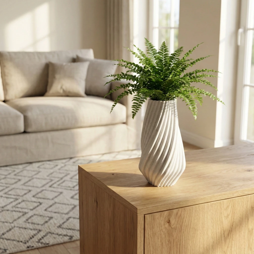 Çok Yönlü Kullanım: Sukulentler, küçük kaktüsler veya tek dal yapay bitkiler (örneğin okaliptüs veya pampas) ile harika bir uyum yakalar. Çiçeksiz olarak tek başına kullanıldığında bile güçlü bir heykelimsi duruş sergiler.