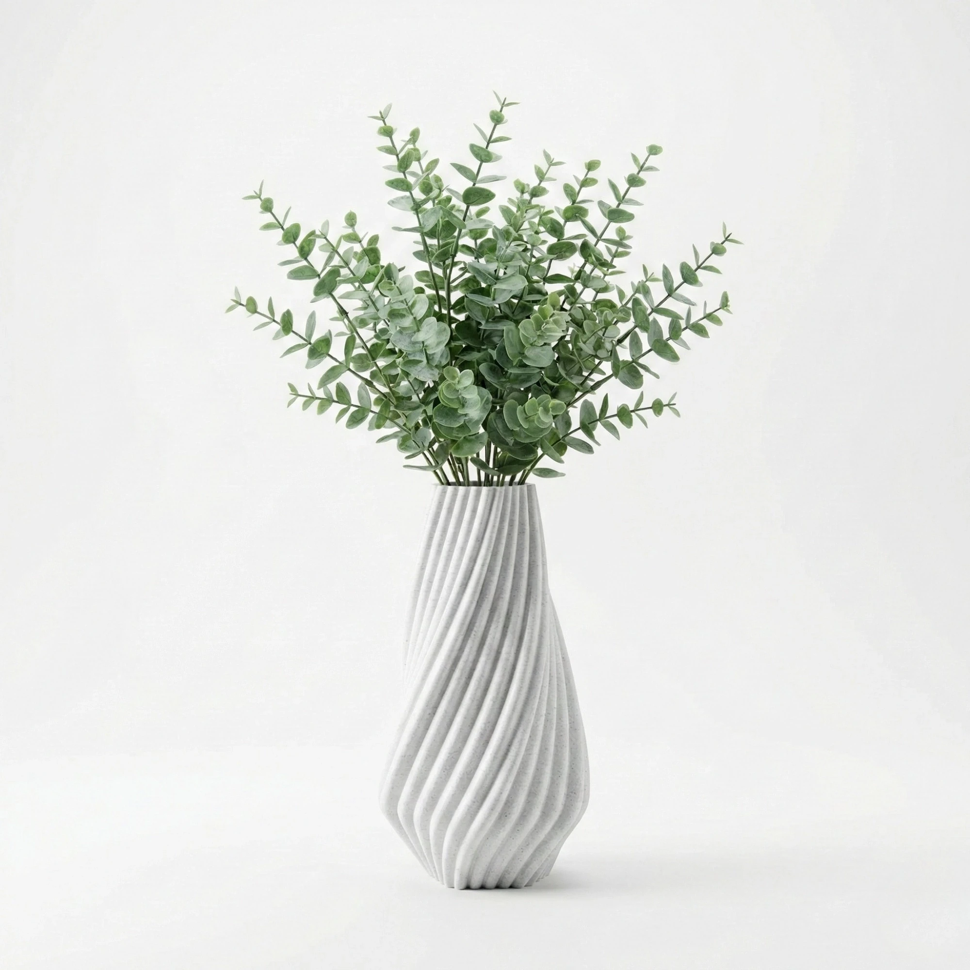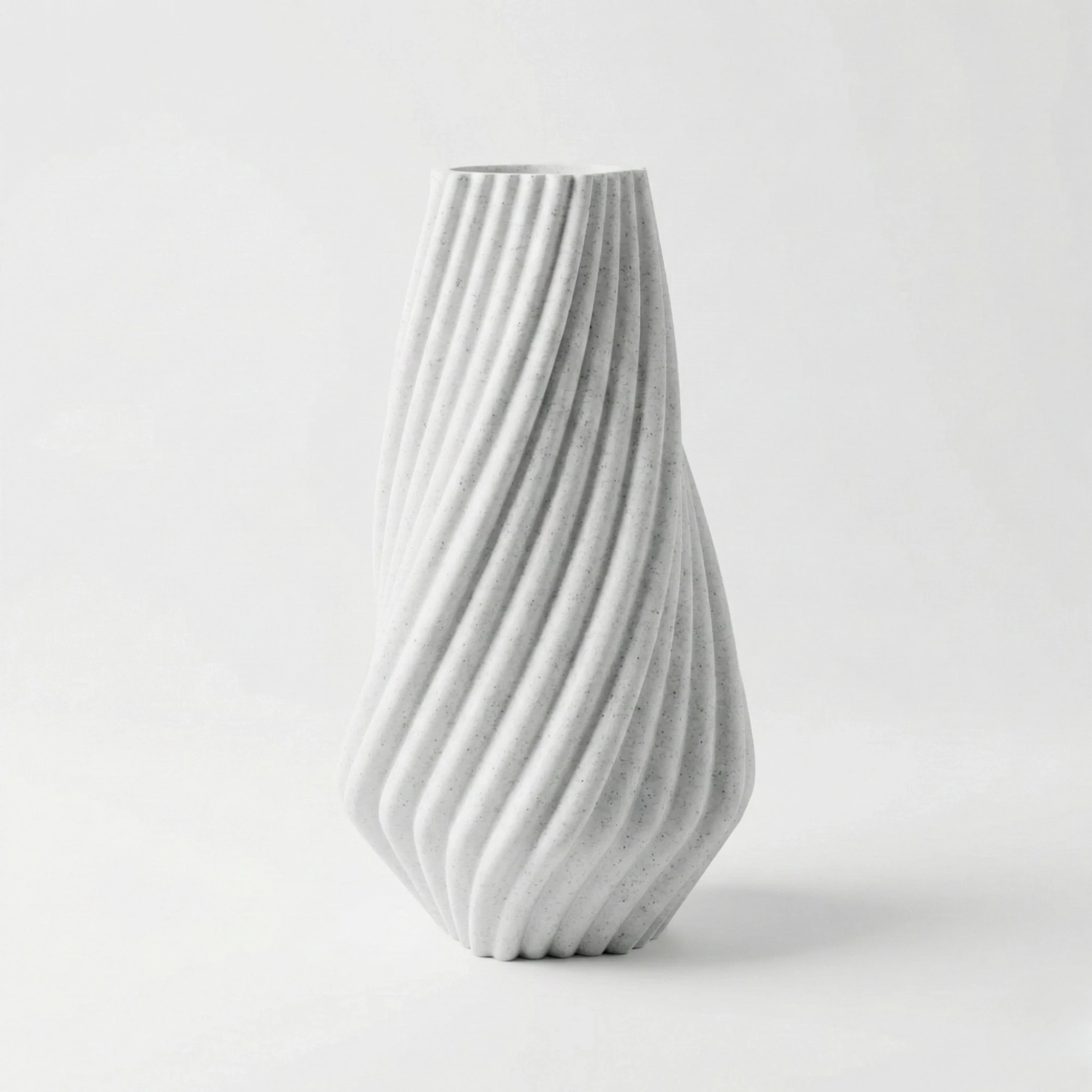 Benzersiz Spiral Form: Vazonun tabanından boynuna doğru süzülen burgulu yapı, ışık ve gölge oyunlarıyla derinlikli bir görüntü oluşturarak dikkatleri üzerine çeker.