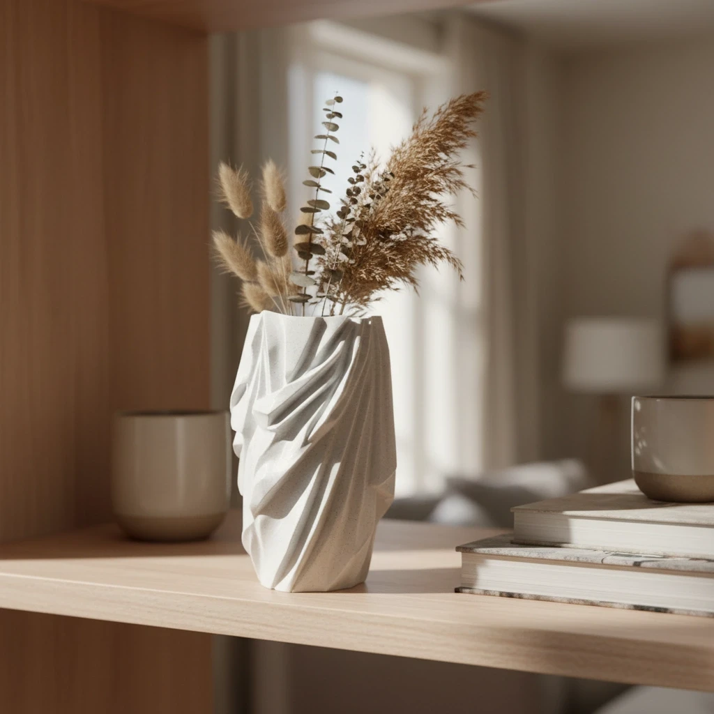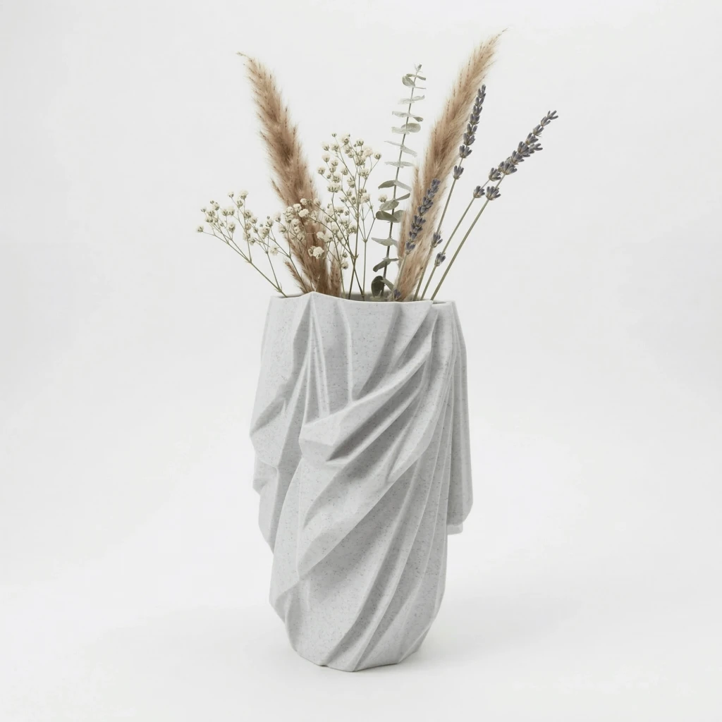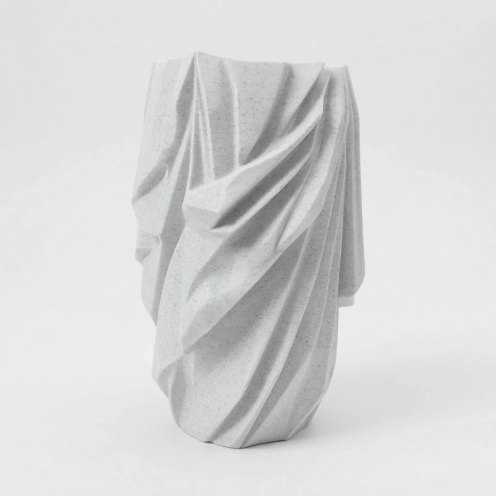 Evinizin veya ofisinizin atmosferini anında değiştirecek, heykelsi duruşuyla göz kamaştıran eşsiz bir tasarım. Katlanmış bir kumaşın zarif dökümünü ve doğal taşın asil dokusunu bir araya getiren bu dekoratif vazo, modern yaşam alanları için özel olarak üretildi.