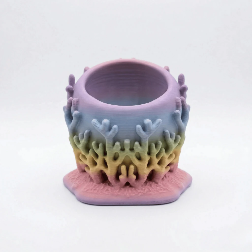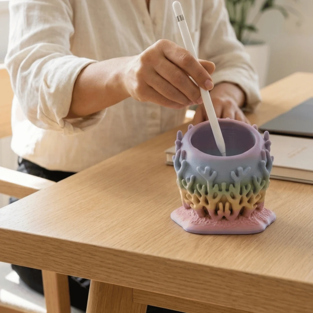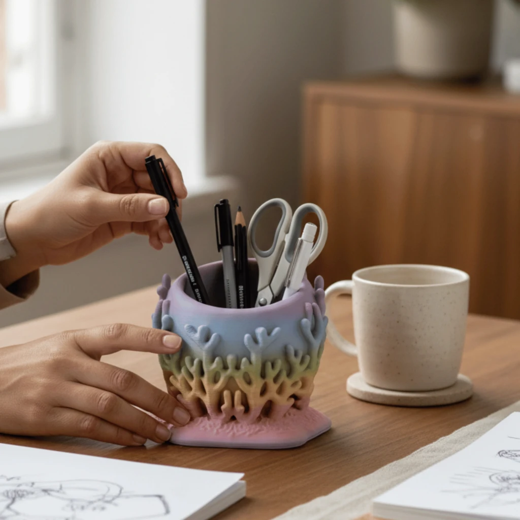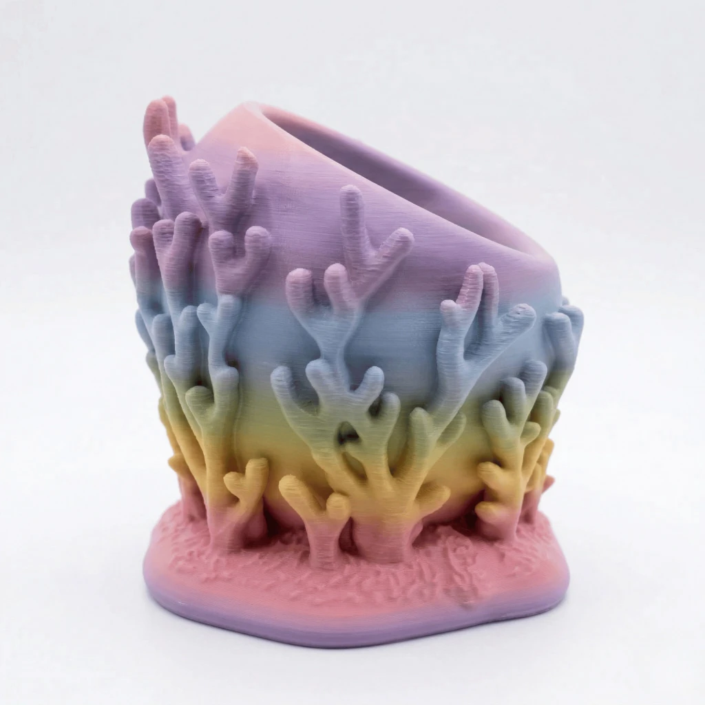Sevdiklerinizi mutlu etmenin veya kendi çalışma alanınızı kişiselleştirmenin en zarif yolu. Deniz altının eşsiz mercan resiflerinden ilham alınarak tasarlanan bu özel masaüstü kalemlik, pastel gökkuşağı renk geçişleriyle bulunduğu ortama modern ve sanatsal bir dokunuş katar.