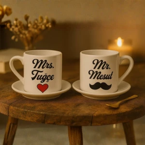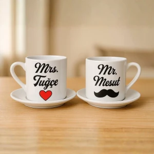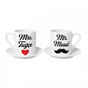 Kişiye Özel Çift Kahve Fincanı Seti – İsim Baskılı Porselen Fincan & Tabak – Hediye Kutulu 2’li Set