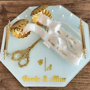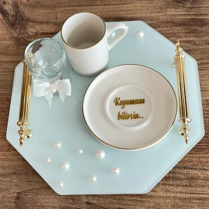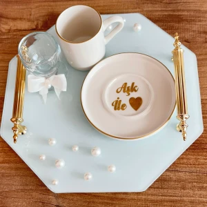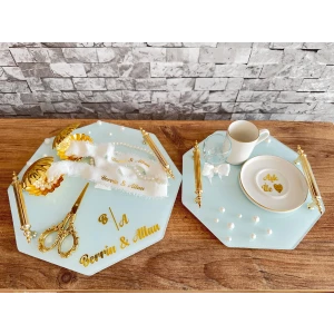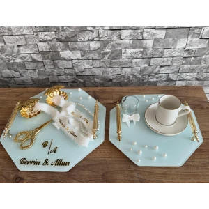 İncili Söz Nişan İsteme Tepsisi ve Damat Kahvesi Takımı (Gold Altıgen)