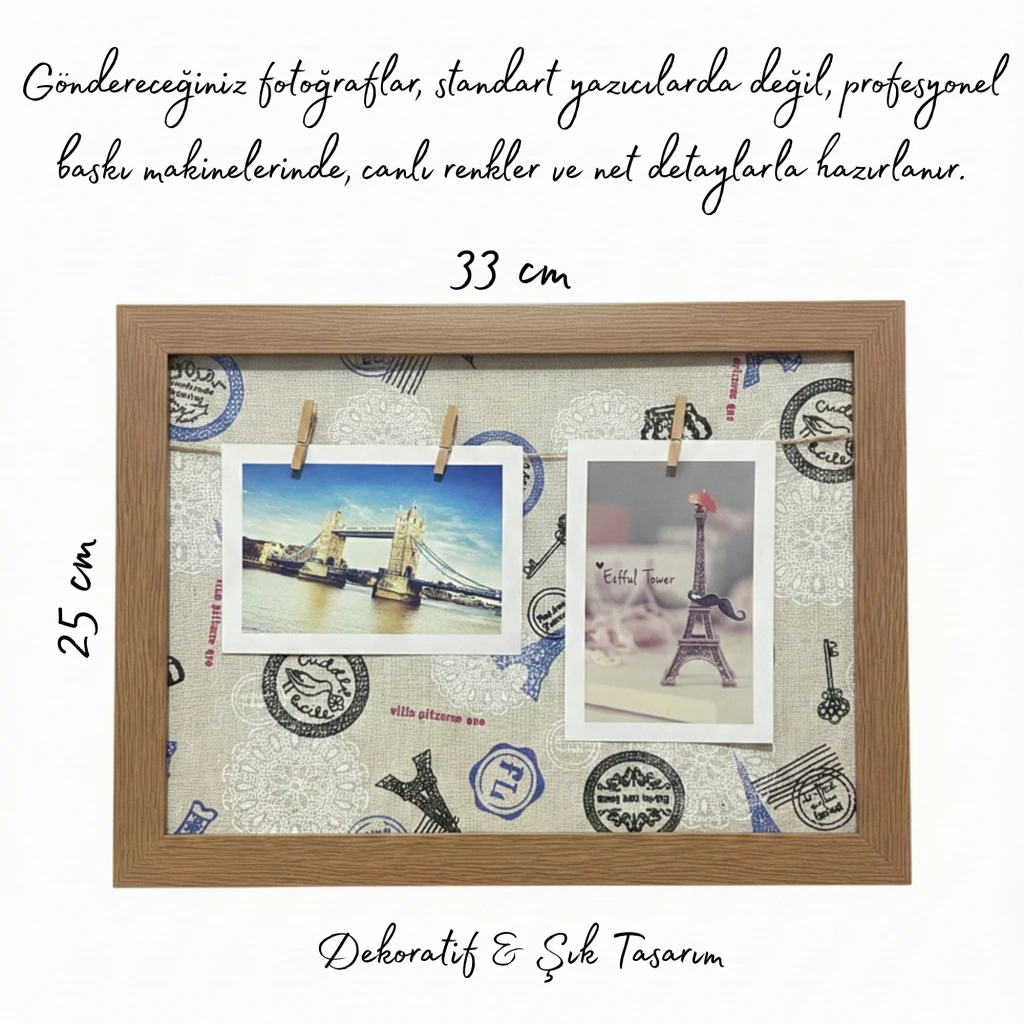 Zeminindeki vintage seyahat teması (Eyfel Kulesi, damgala ve pullar),fotoğraflarınıza sanatsal bir derinlik katar. 33x25 cm boyutlarındaki ideal yapısı sayesinde ister duvara asarak, ister masa üzerinde dayalı olarak kullanabilirsiniz.