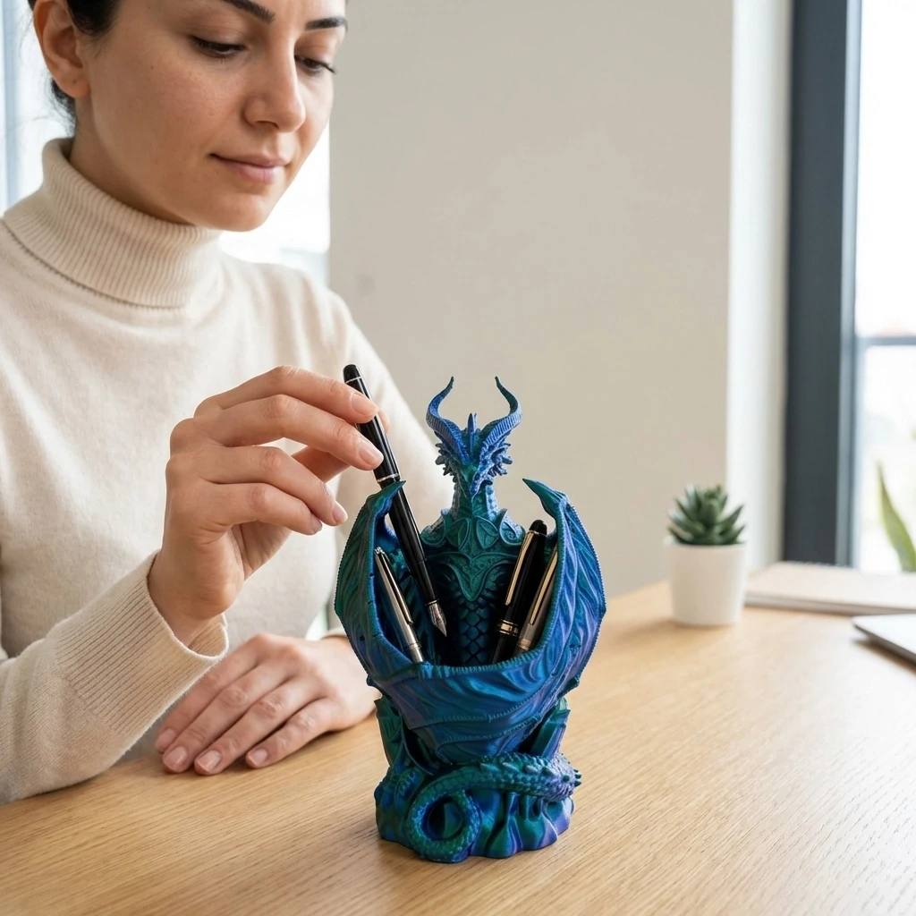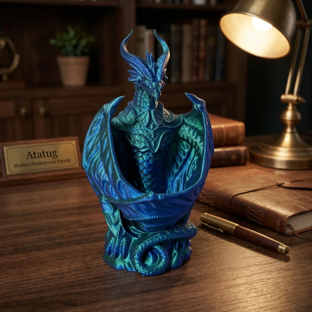 Masanızın yeni koruyucusu ile tanışın! Wyrmrest Masa Arkadaşı, sadece bir kalemlik değil, 3D baskı teknolojisinin zarafetle buluştuğu bir sanat eseridir. Kanatlarının arasında kalemlerinizi güvenle taşıyan bu ejderha, masanızdaki dağınıklığı toplarken estetik bir duruş sergiler.