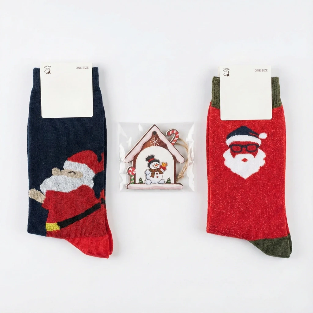 Setimiz, yüksek kaliteli pamuklu dokusuyla ayaklarınızı sıcacık tutacak iki farklı tasarımda Noel Baba desenli çorap ve dekoratif ahşap kardan adam süsünden oluşmaktadır. İster ofis arkadaşınıza, ister sevgilinize, isterseniz de en yakın arkadaşınıza alabileceğiniz; açıldığı anda gülümseten, hazır konsept bir hediye paketidir.