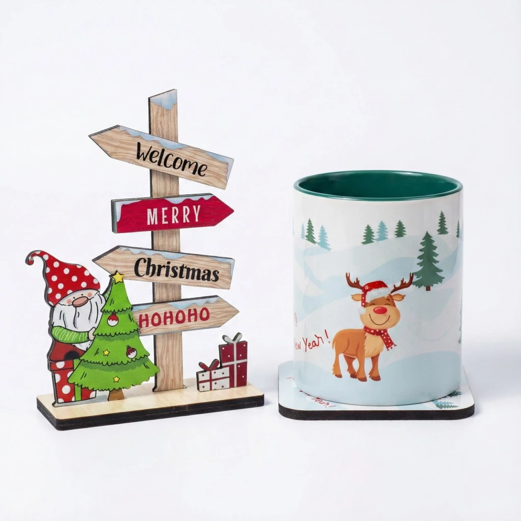 Ahşap Yılbaşı Masaüstü Dekoru: "Welcome Merry Christmas HOHOHO" yazılı yön tabelaları, sevimli bir Noel cücesi, süslü çam ağacı ve hediye paketleri figürleriyle çalışma masalarına, raflara veya sehpalara anında yılbaşı atmosferi katacak harika bir dekoratif obje.