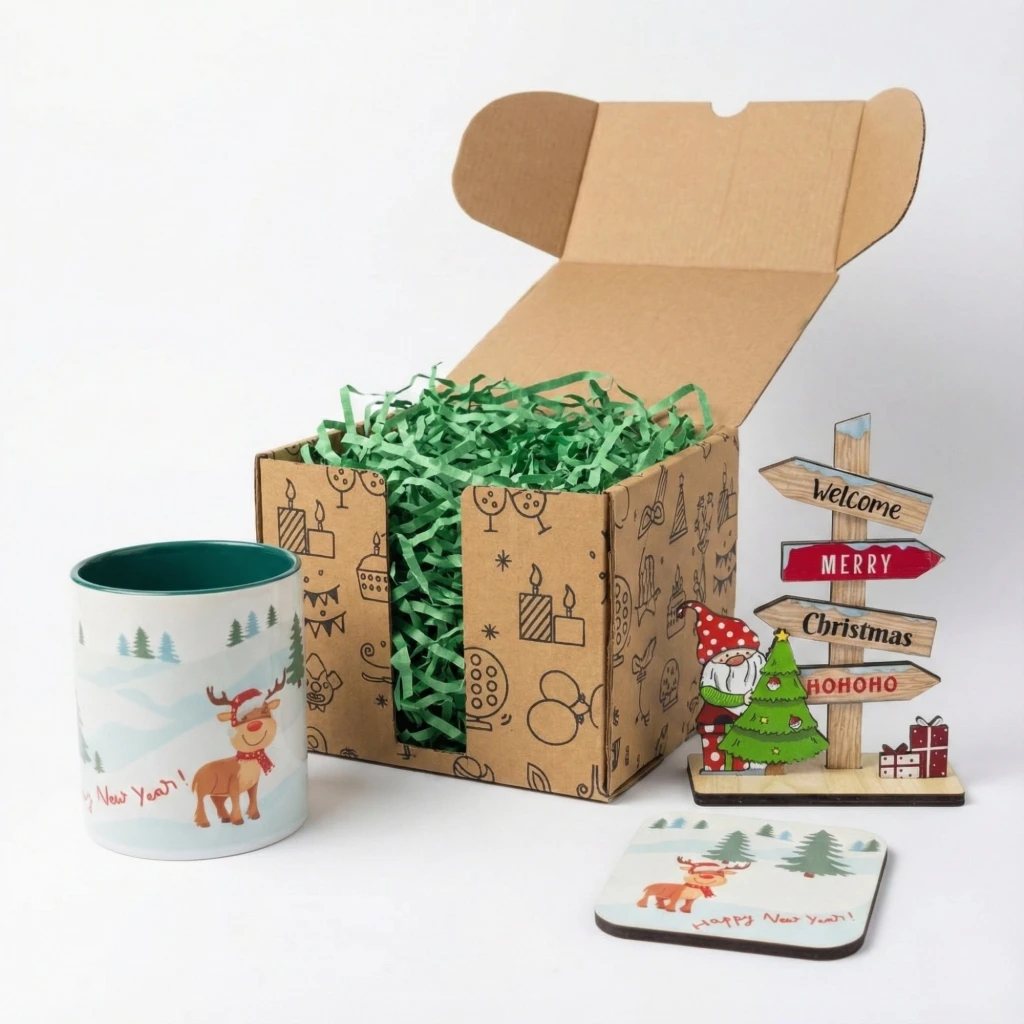 Uyumlu Bardak Altlığı: Kupa ile birebir aynı sevimli geyik tasarımına ve "Happy New Year!" yazısına sahip kare bardak altlığı, masalarınızı korurken takım ruhunu tamamlıyor.