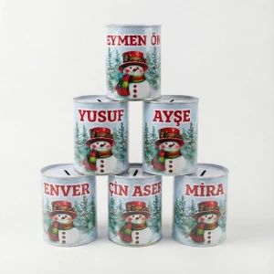 Kişiye Özel İsim Baskılı Yılbaşı Temalı Kardan Adam Metal Kumbara (Hediye Paketli 1 Adet)